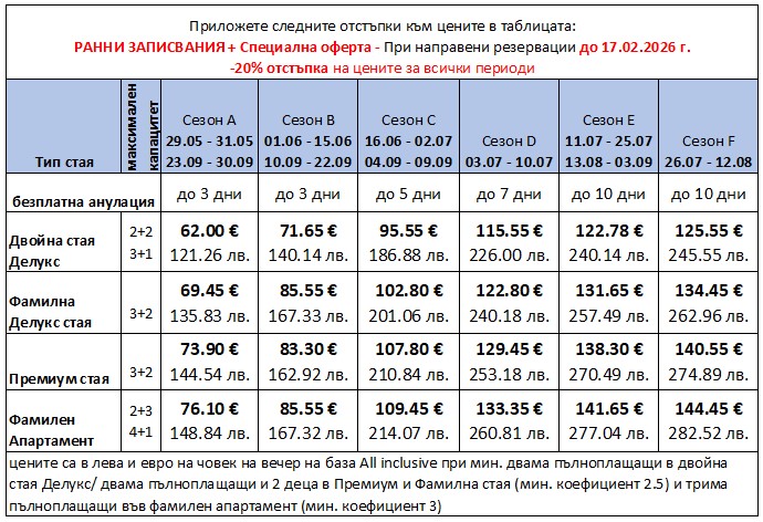 - При настаняване на 1 възрастен или 1 възрастен с 1 на редовно легло - попитайте наш консултант за цена (тел. 024111600)
