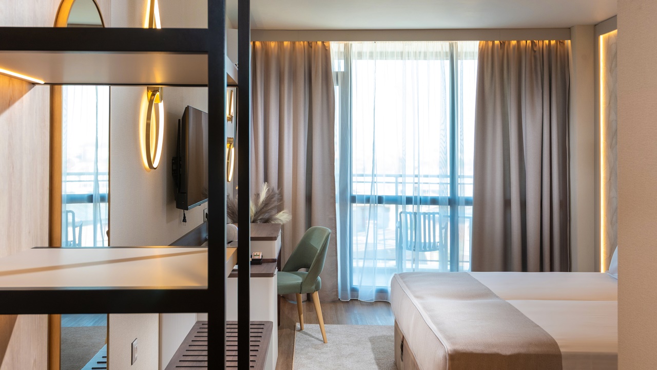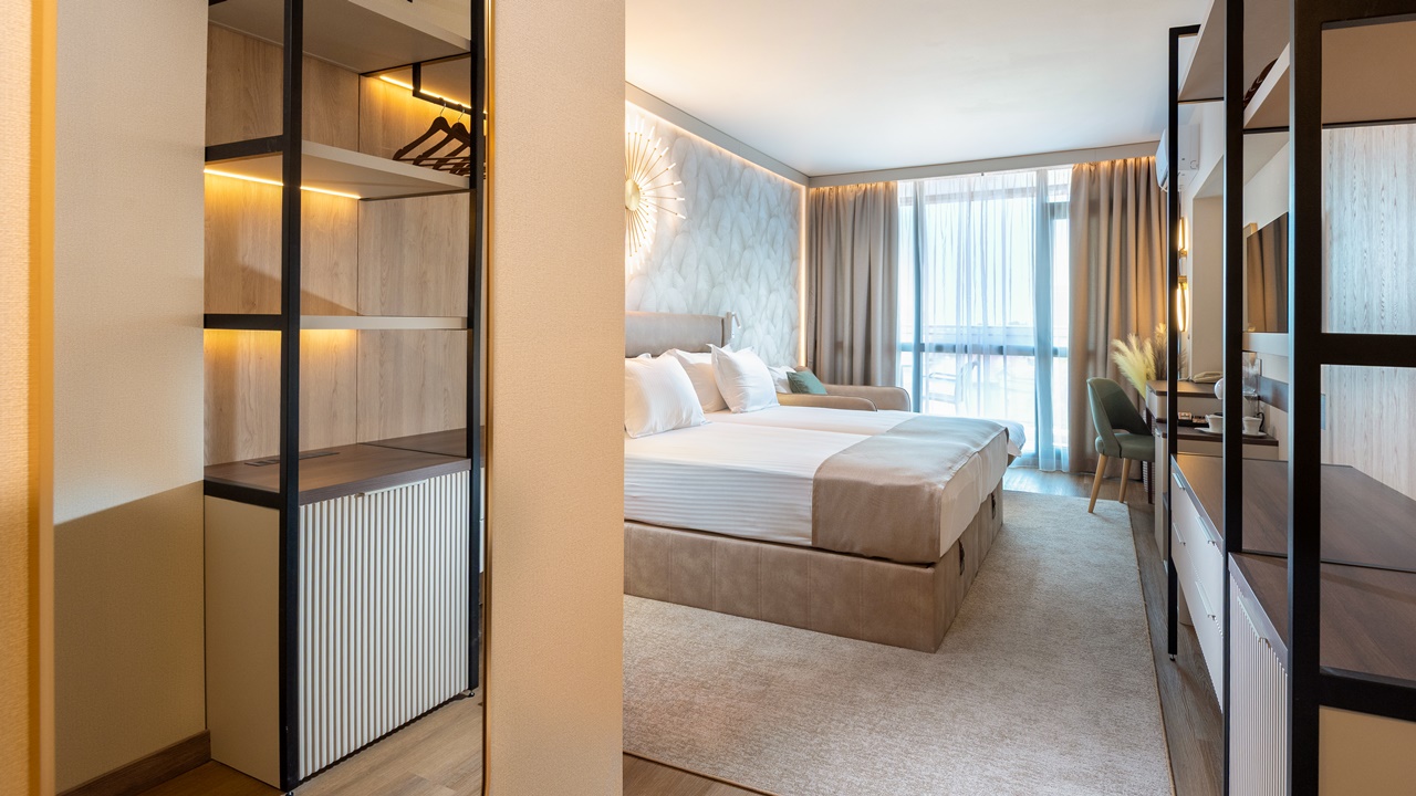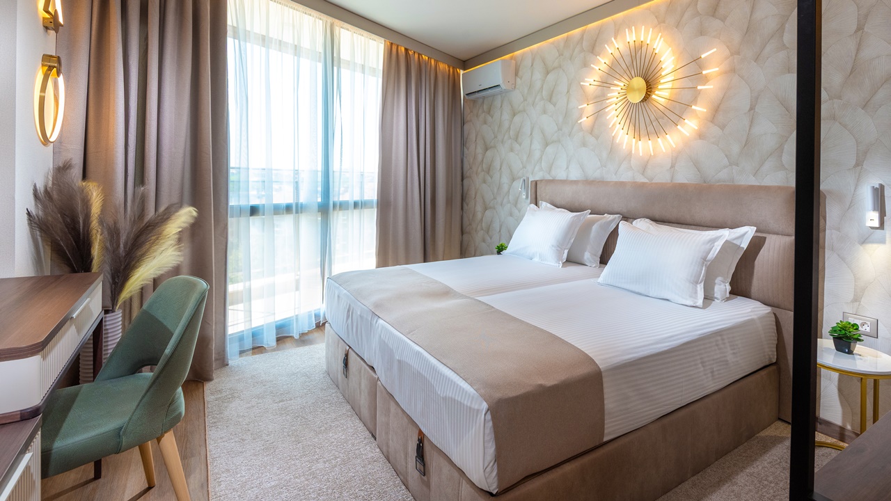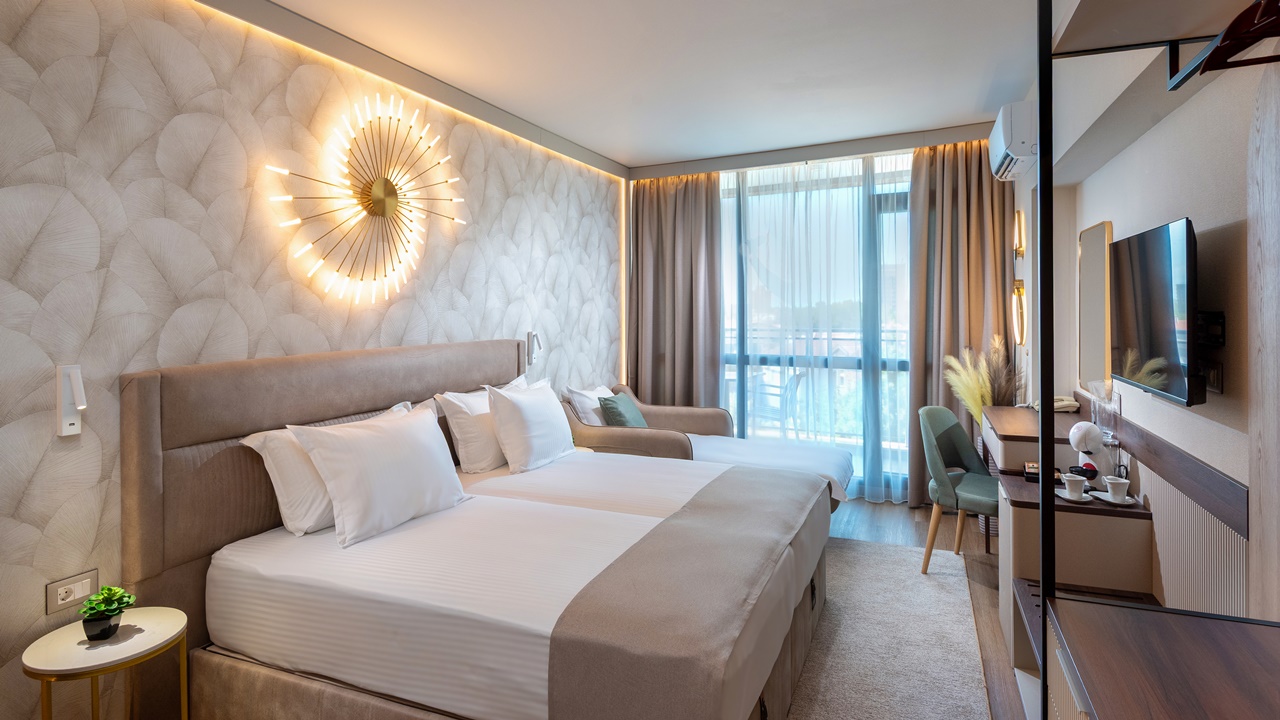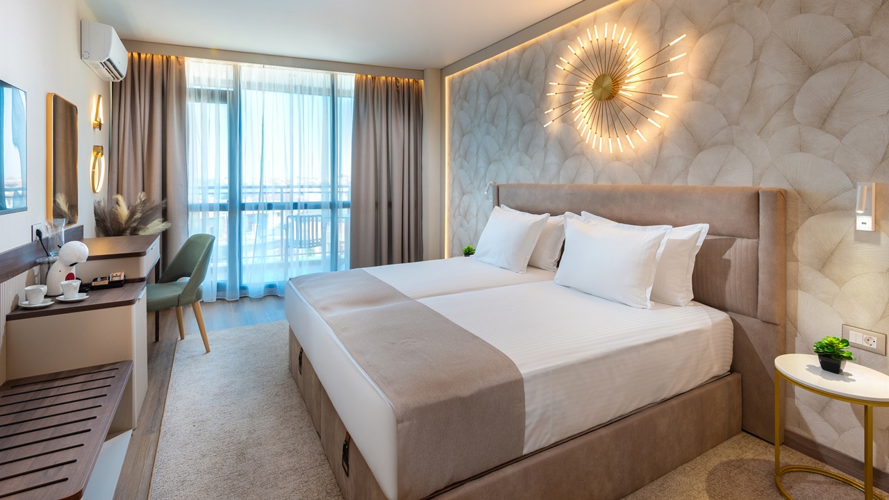 - Двойна стандартна стая - Приблизителна площ между 22 - 26 м2. Всички двойни стаи разполагат с едно двойно легло или две единични легла (позиционирани едно до друго) и едно допълнително легло - разтегателен фотьойл (90см х 190см). Обзаведени са с климатик, плоскоекранен телевизор, минибар, сейф, кафе машина, WiFi, баня с душ кабина, сешоар и тоалетни принадлежности, тераса