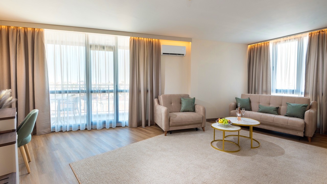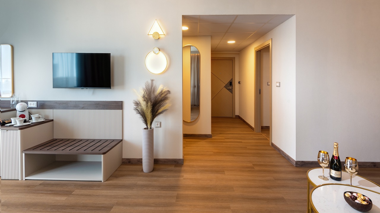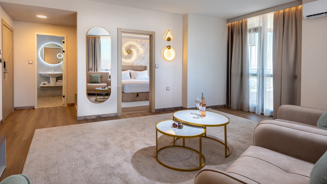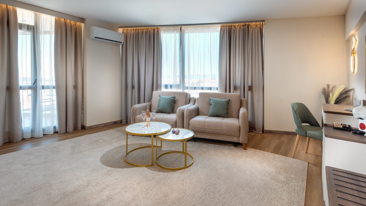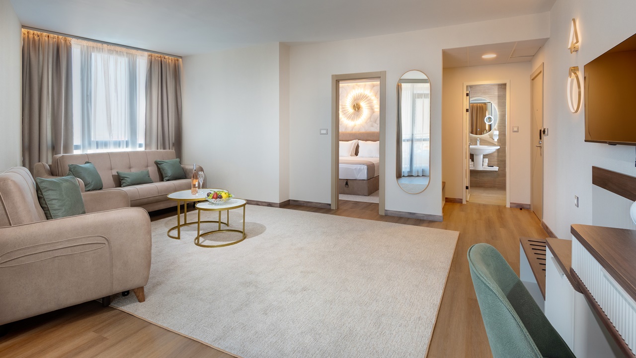 - Апартамент с 1 спалня - Приблизителна площ 36 м2. Апартаментите се състоят от две стаи - спалня и дневна, разделени с врата. В спалнята има едно двойно легло или две единични легла (позиционирани едно до друго), а в дневната - разтегателен диван (160см х 190см) или 2 разтегателни фотьойла. Обзаведени са с климатик, плоскоекранен телевизор, минибар, сейф, кафе машина, WiFi, баня с душ кабина, сешоар и тоалетни принадлежности, тераса.