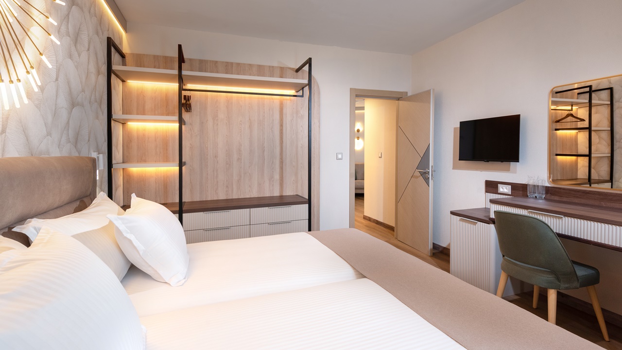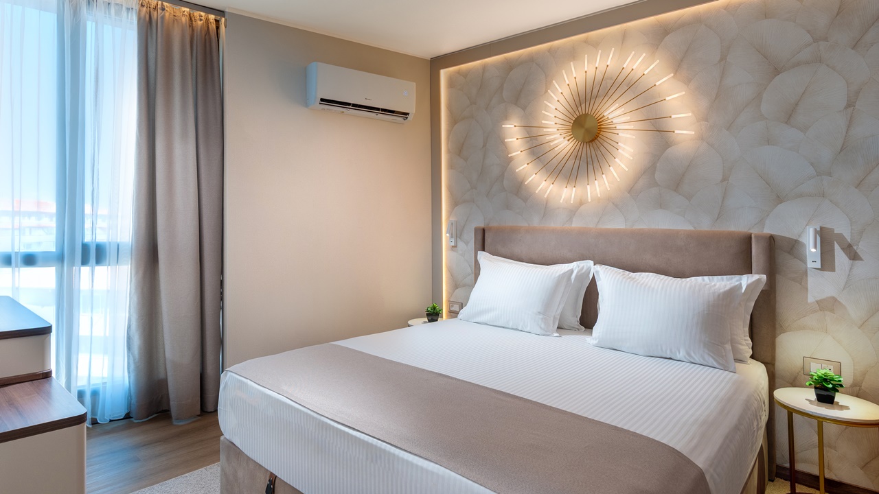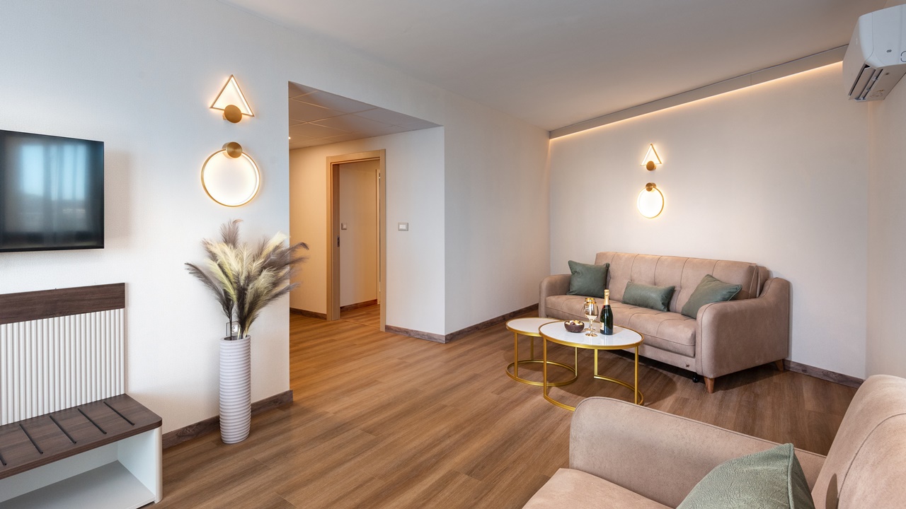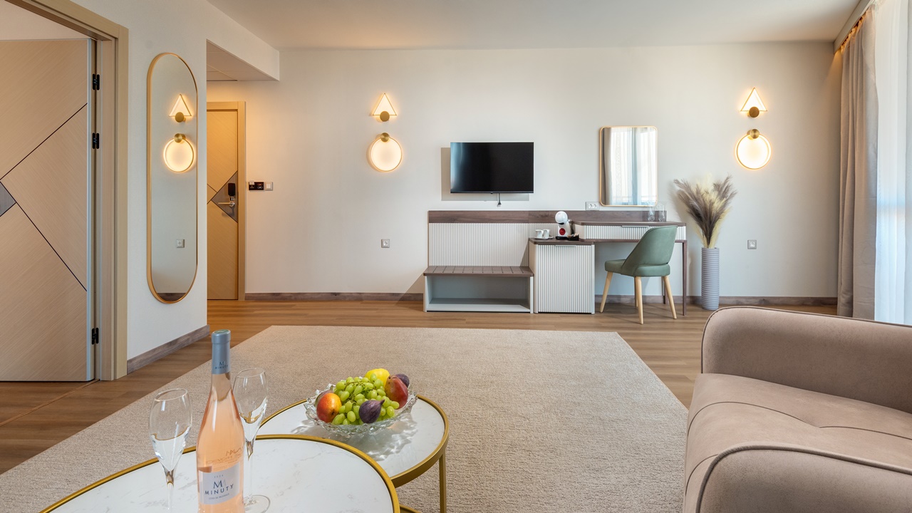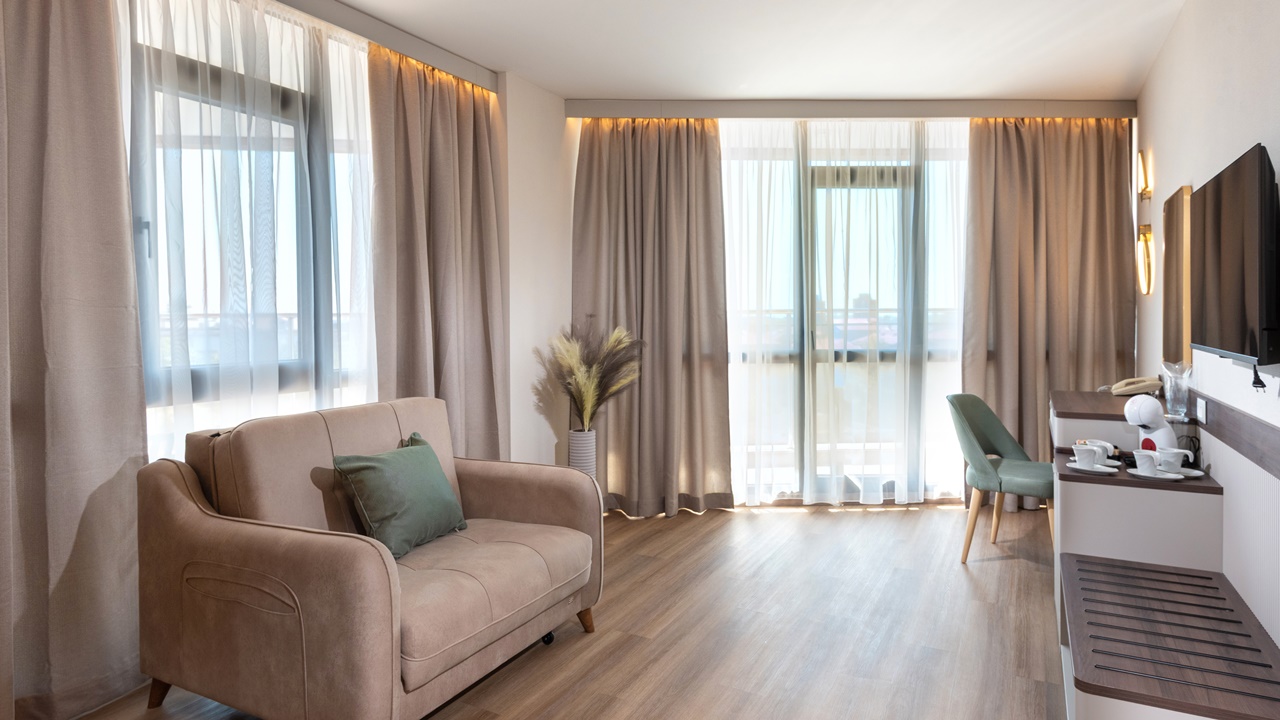 - Апартамент с 1 спалня - Приблизителна площ 36 м2. Апартаментите се състоят от две стаи - спалня и дневна, разделени с врата. В спалнята има едно двойно легло или две единични легла (позиционирани едно до друго), а в дневната - разтегателен диван (160см х 190см) или 2 разтегателни фотьойла. Обзаведени са с климатик, плоскоекранен телевизор, минибар, сейф, кафе машина, WiFi, баня с душ кабина, сешоар и тоалетни принадлежности, тераса.