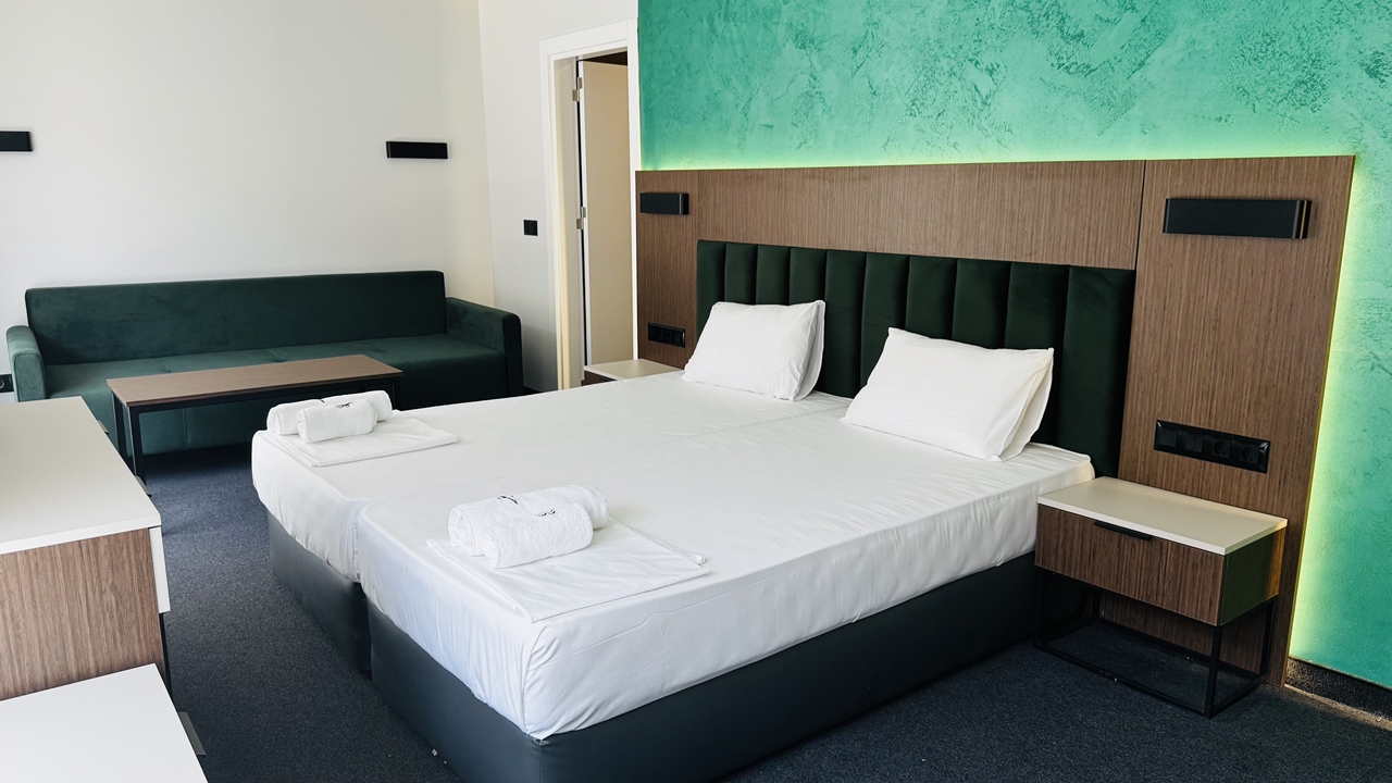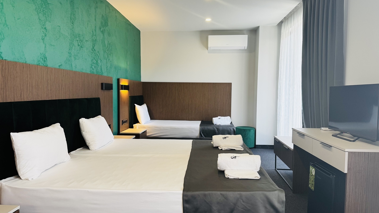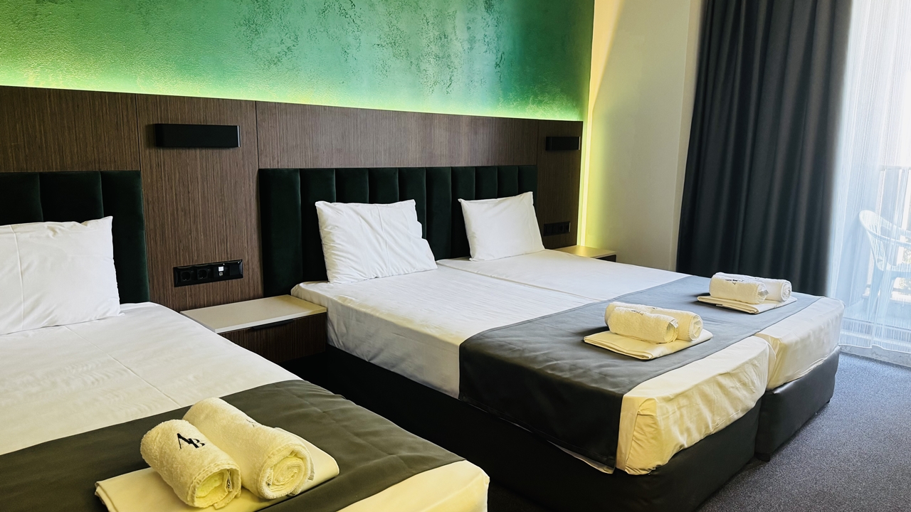 Парк Хотел Атлиман Бийч, гр. Китен предлага настаняване в 300 бр. стилно обзаведени и комфортни двойни стаи, студиа и едноспални апартаменти, които съчетават уют и функционалност, осигурявайки прекрасни условия за почивка както на семейства с деца, така и на двойки, групови мероприятия и фирмени събития.