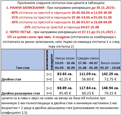 - За периода 10.05.2026 - 06.06.2026: Изисква се минимален престой от 3 нощувки