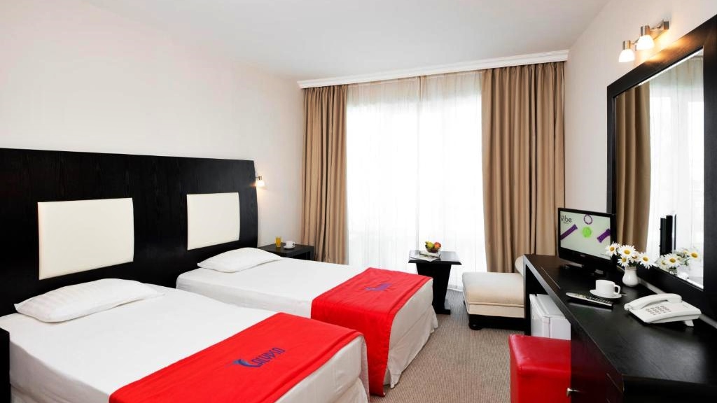 - двойна стая - 23 кв.м., разполагат с 2 редовни легла, 1 допълнително легло (сгъваемо), баня/WC (душ, сешоар, паник бутон), климатик (централен), мини хладилник, телефон, сателитна телевизия (LCD)и балкон
