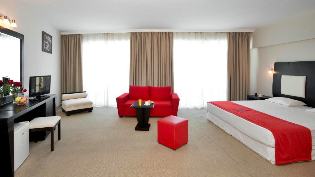- двойна разширена стая - 26 кв.м., разполагат с 2 Двойна голяма стая - 2 редовни легла, 2 допълнителни легла (разтегателен диван), баня/WC (душ, сешоар, паник бутон), климатик (централен, мини хладилник, телефон, сателитна телевизия (LCD) и балкон