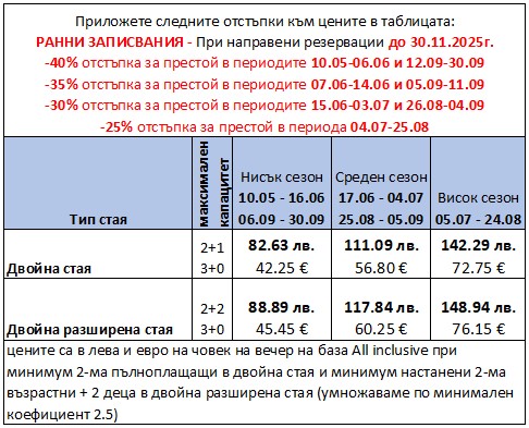 - За периода 10.05.2026 - 06.06.2026: Изисква се минимален престой от 3 нощувки