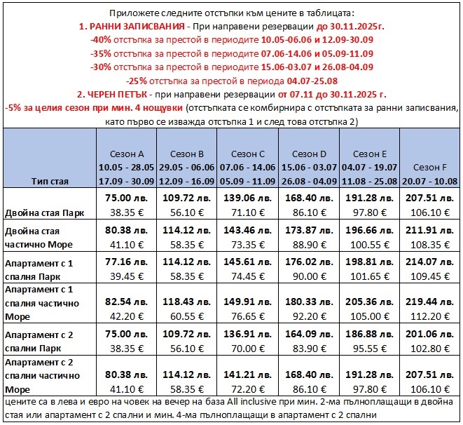 • Офертата е валидна при минимум двама пълноплащащи настанени в двойна стая парк/море или апартамент с 1 спалня парк/море и четирима пълноплащащи в апартамент с 2 спални парк/море