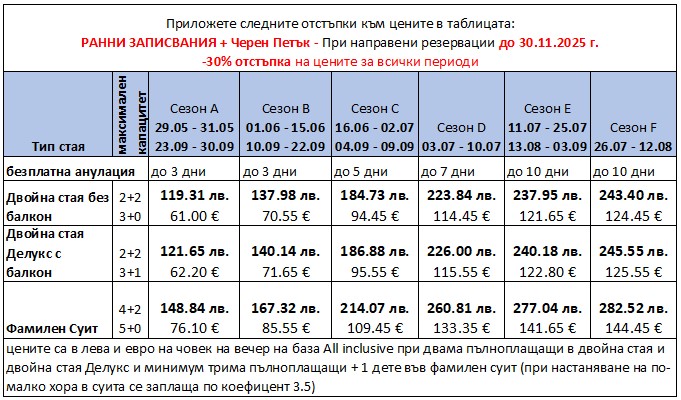 - за настаняване във фамилен суит се изискват минимум настанени 3 възрастни + 1 дете. При настаняване на по-малко хора в суита, се заплаща при коефициент 3.5