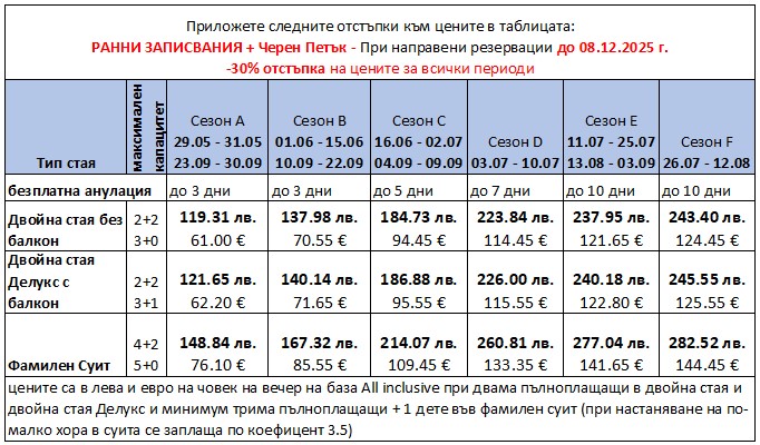 - за периодите 29.05 - 15.06 и 10.09 - 30.09, безплатна анулация до 3 дена преди настаняване
