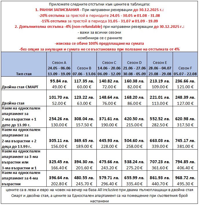 - За периода 14.06.2026 - 10.09.2026: Изисква се минимален престой от 5 нощувки (възможен е и по-кратък престой, но без отстъпката за ранни записвания)