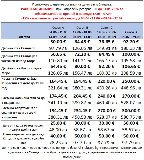 • За периода 04.06.2026 - 22.09.2026: Офертата е валидна при минимален престой от 3 нощувки