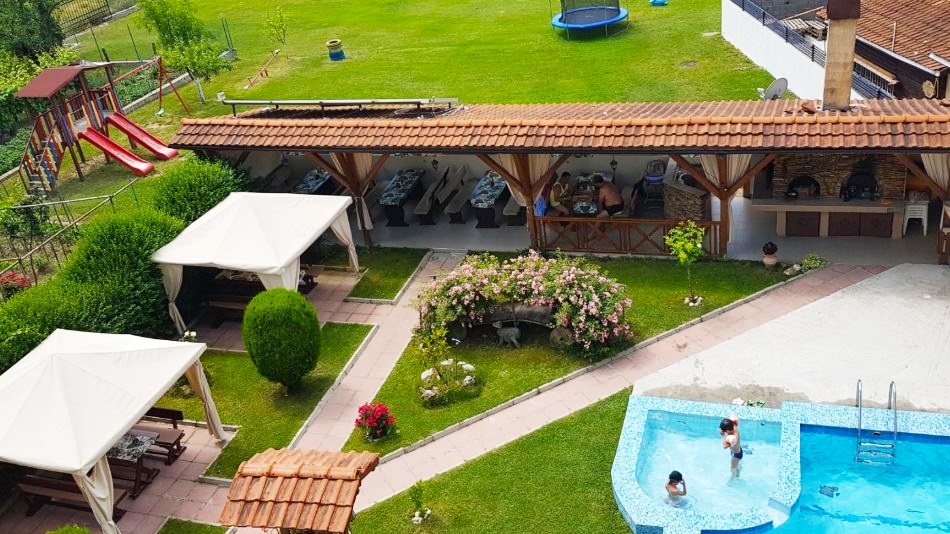 На барбекюто с предварителна заявка във ваше присъствие се приготвя печено агне, печено пиле, печено прасенце. Външната градина е една малка приказка - с минерален басейн и шезлонги, джакузи, прекрасно оформени алеи, зеленина и шатри, под които на сянка спокойно може да се хапва и пийва. И всичко това се ползва само от гостите на хотела, който работи целогодишно.