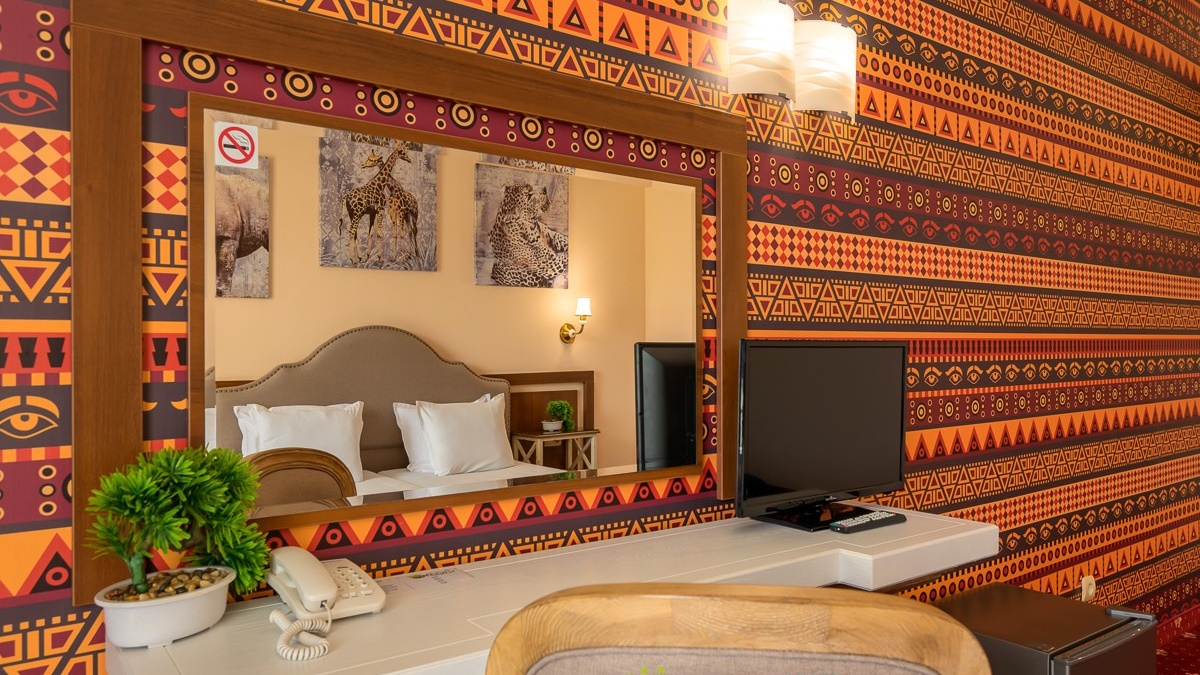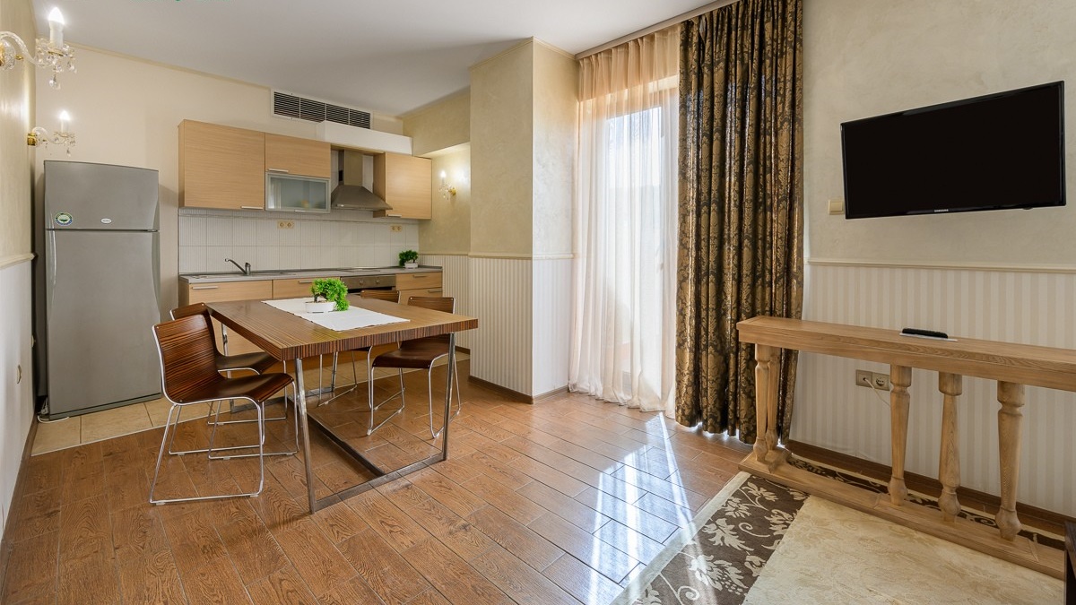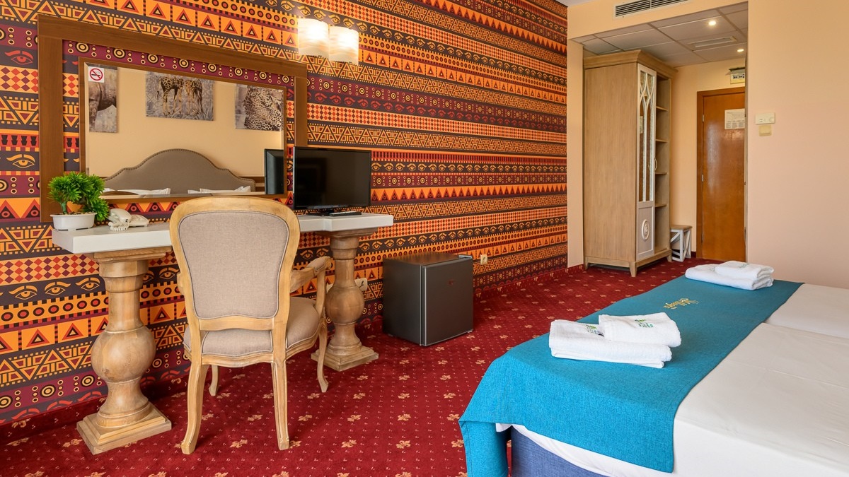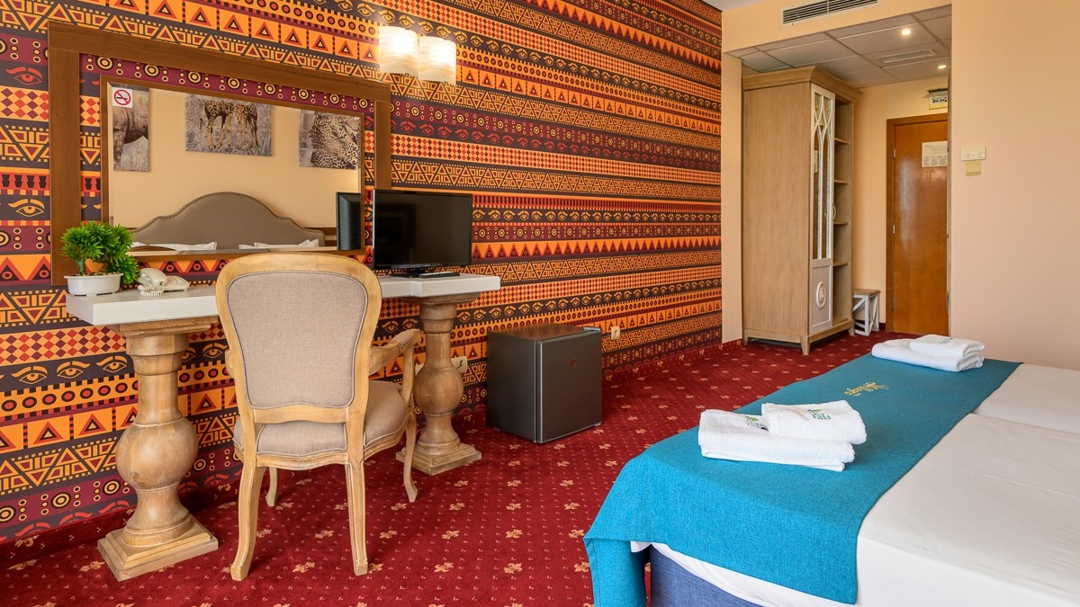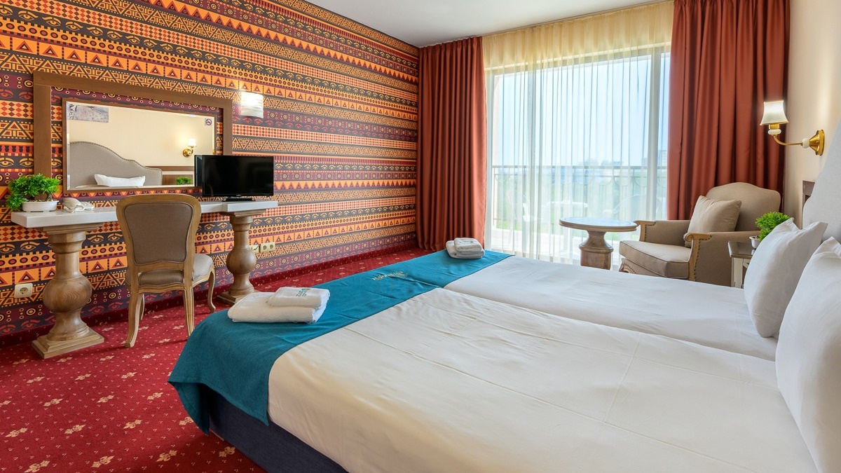 - Описание на помещенията: Две единични легла, Фотьойл, Маса, Стол, Гардероб, Място за багаж, LCD телевизор, Хладилник, Кабелна телевизия с канали на няколко езика, Огледало, Централна климатизация, Директна телефонна връзка, Баня с душ кабина, Сешоар, Сушилник за дрехи, Балкон с маса и столове