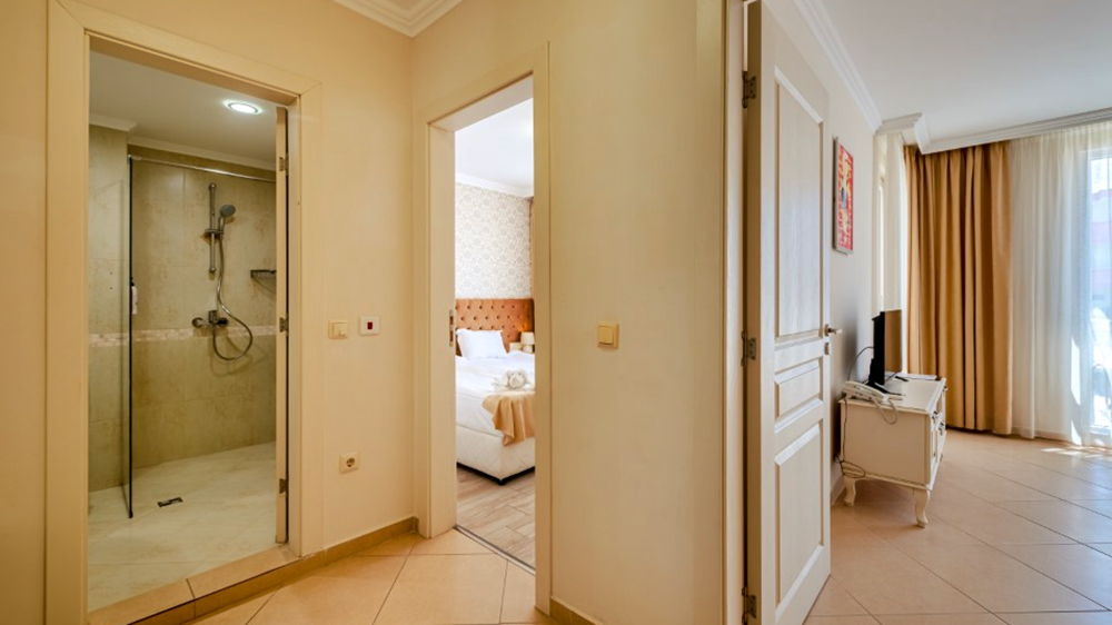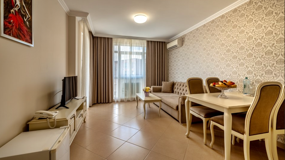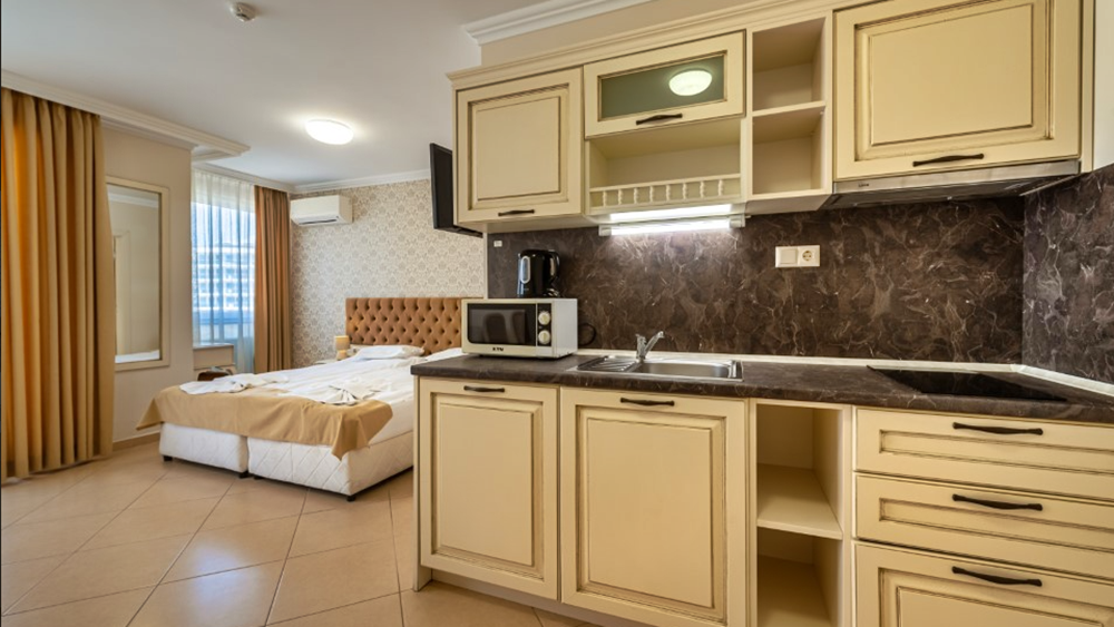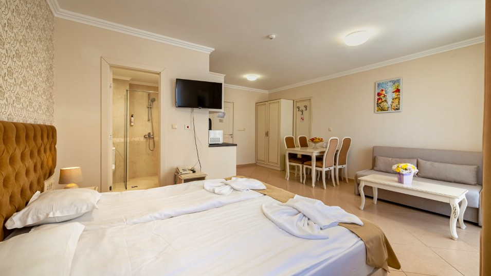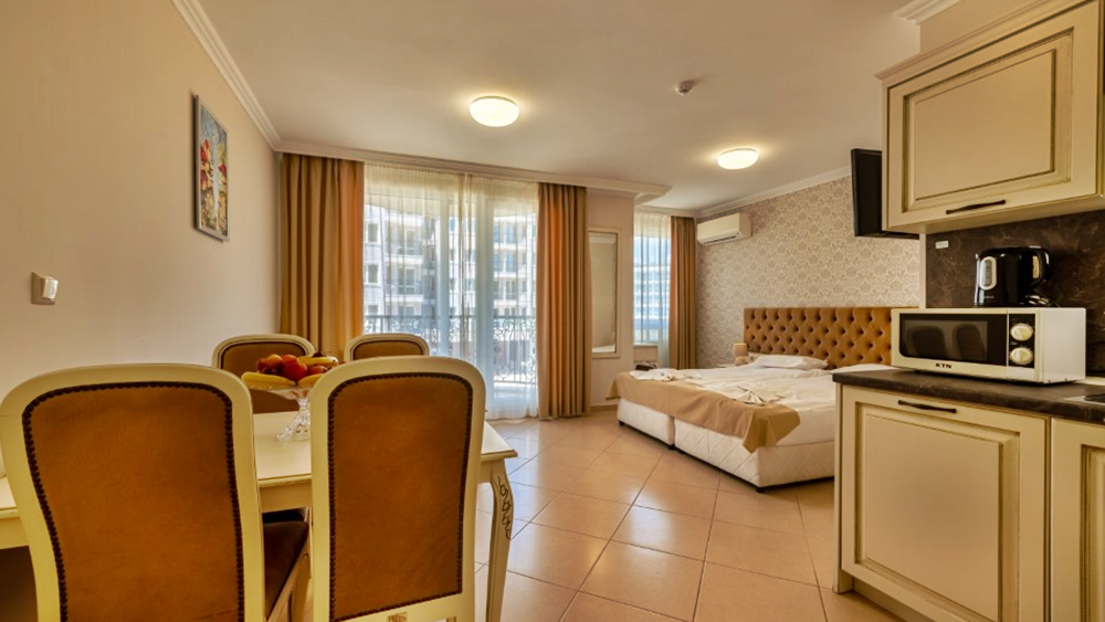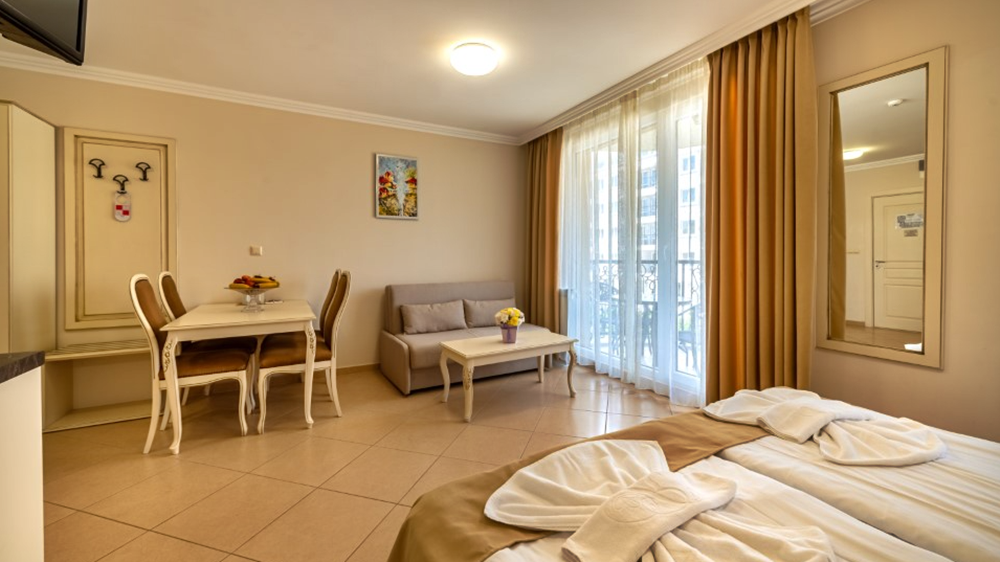 - Едноспален апартамент - състои се от две помещения - всекидневна с кухненски кът и спалня. Разполага с климатик, Wi-Fi, сейф, телефон, санитарен възел (душ, WC, сешоар), тераса и антре. Всекидневната предлага разтегателен диван, маса за хранене с четири стола, малка маса за кафе, шкаф и кабелна телевизия