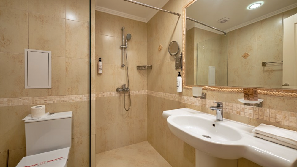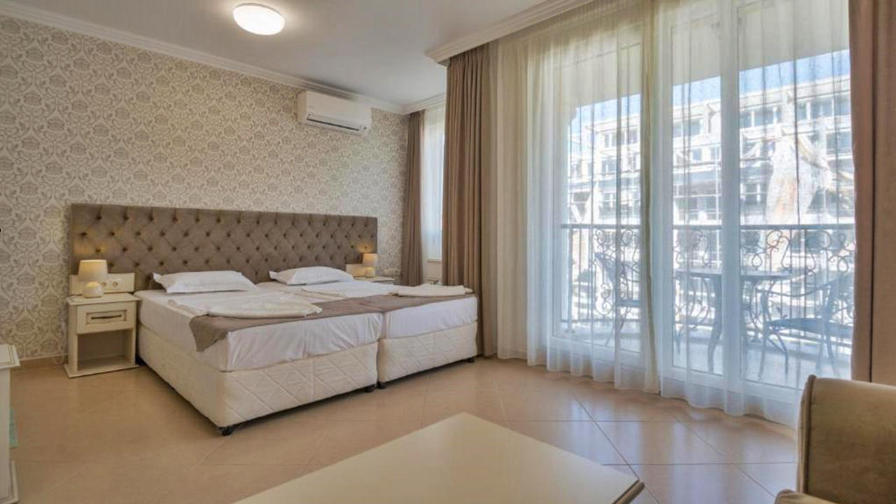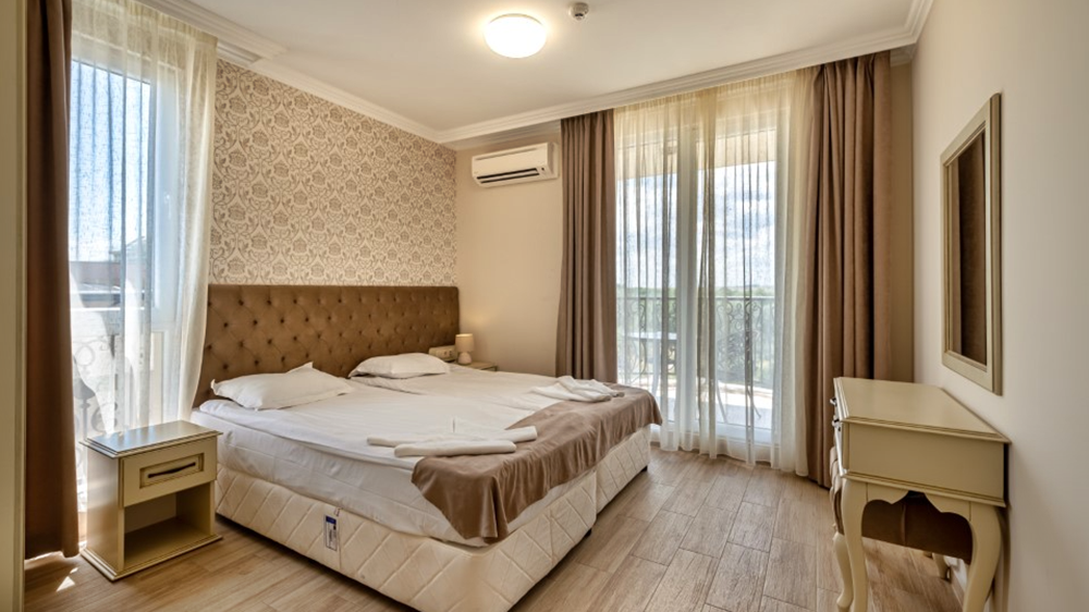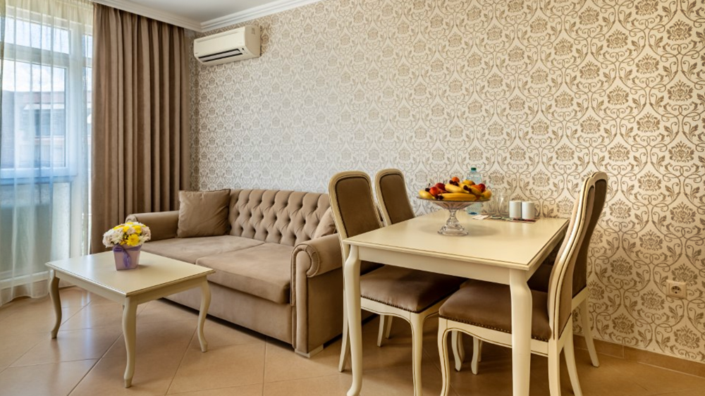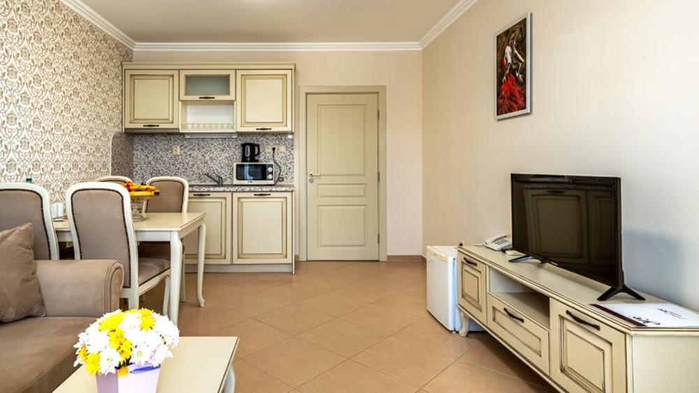 - Едноспален апартамент - състои се от две помещения - всекидневна с кухненски кът и спалня. Разполага с климатик, Wi-Fi, сейф, телефон, санитарен възел (душ, WC, сешоар), тераса и антре. Всекидневната предлага разтегателен диван, маса за хранене с четири стола, малка маса за кафе, шкаф и кабелна телевизия