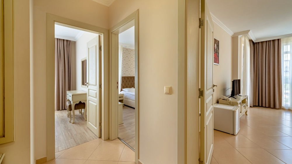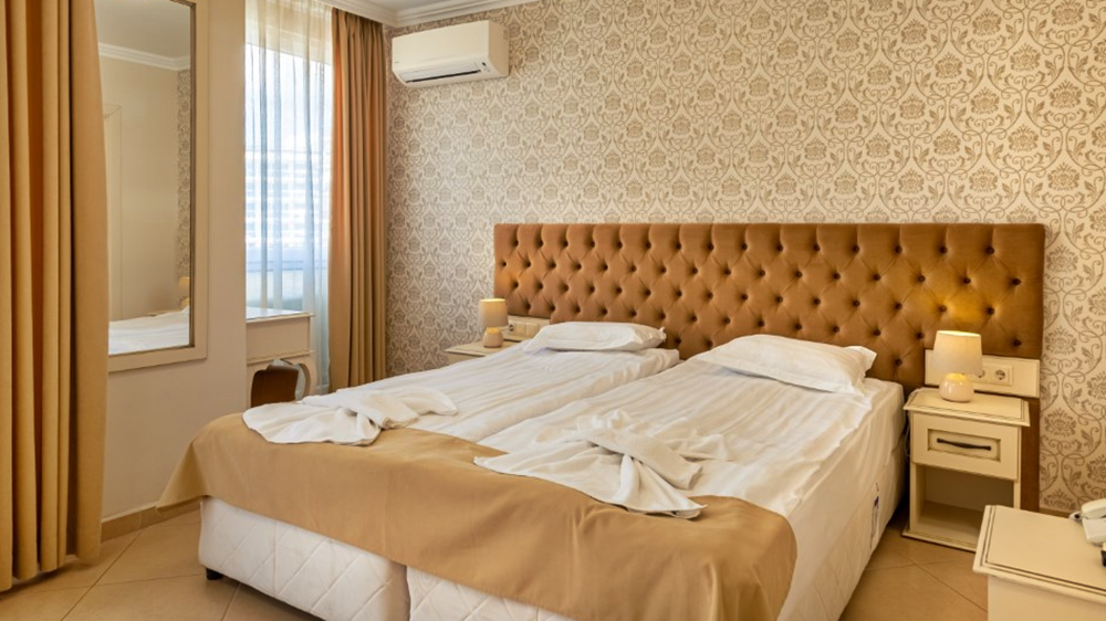 - Двуспален апартамент - състои се от три помещения - всекидневна с кухненски кът и две спални. Разполага с климатик, Wi-Fi, сейф, телефон, санитарен възел (душ, WC, сешоар), тераса и антре. Всекидневната предлага разтегателен диван, маса за хранене с четири стола, малка маса за кафе, шкаф и кабелна телевизия. Диванът в двуспалните апартаменти е за 1 възрастен или две деца (130 х 176 см.). Кухненският кът е оборудван с микровълнова печка, електрическа кана и хладилник (БЕЗ кухненска посуда)