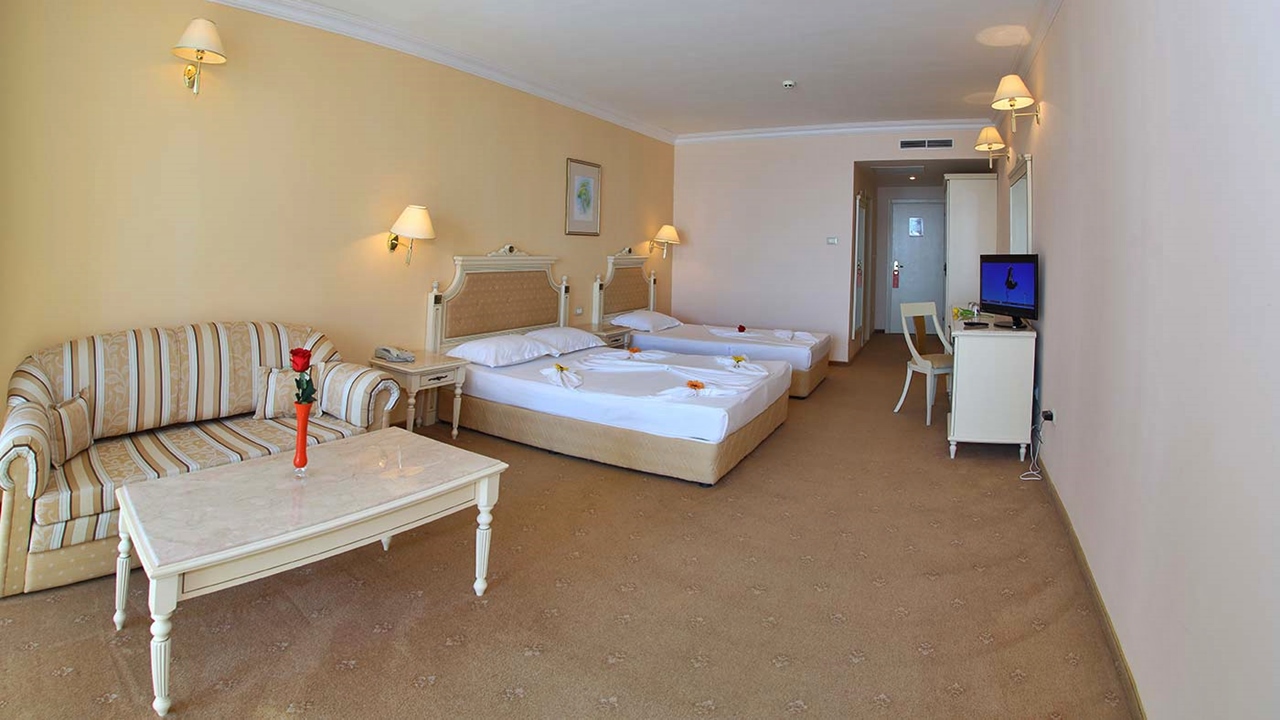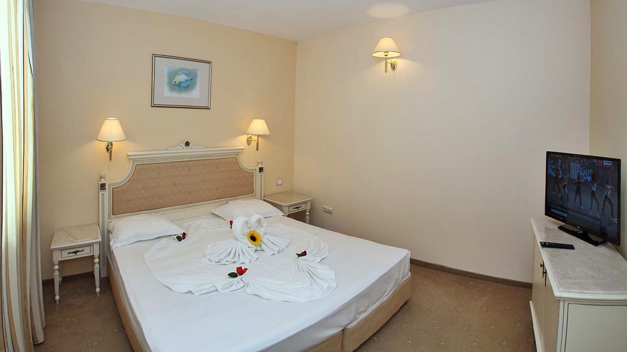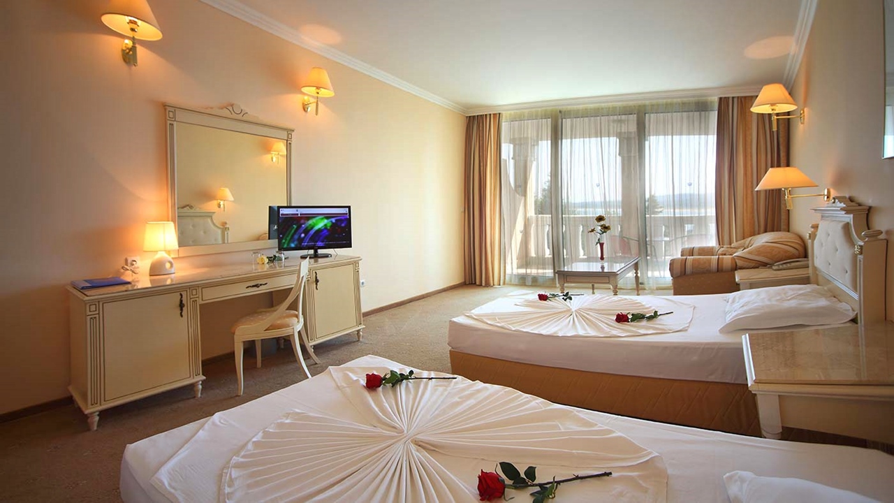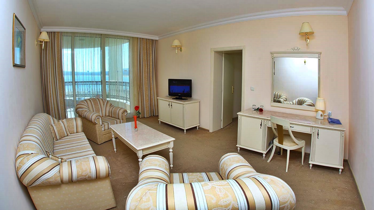 - Джуниър суит Парк/Море - 32-36 кв.м. Представлява едно по-голямо от стандартната стая помещение с две легла (едно единично и едно - персон и половина) или една спалня и кът за сядане с двоен разтегателен диван. Може да бъде по избор с гледка към парка или морето