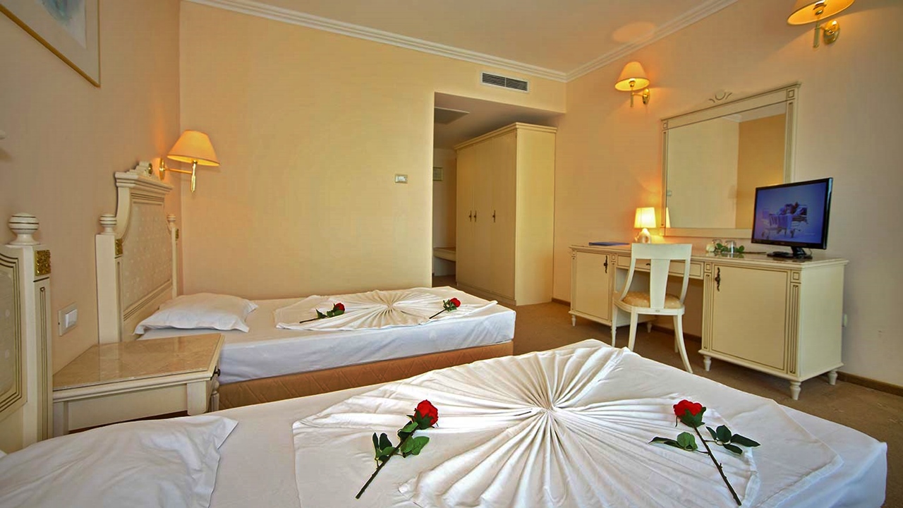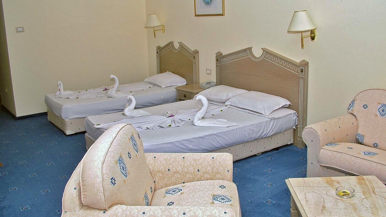 - Двойна стая Стандарт - 26 кв.м. Помещението разполага с две единични легла, които при желание на гостите могат да бъдат събрани, и едно допълнително легло под формата на разтегателен фотьойл. Може да бъде по избор с гледка към парка или морето