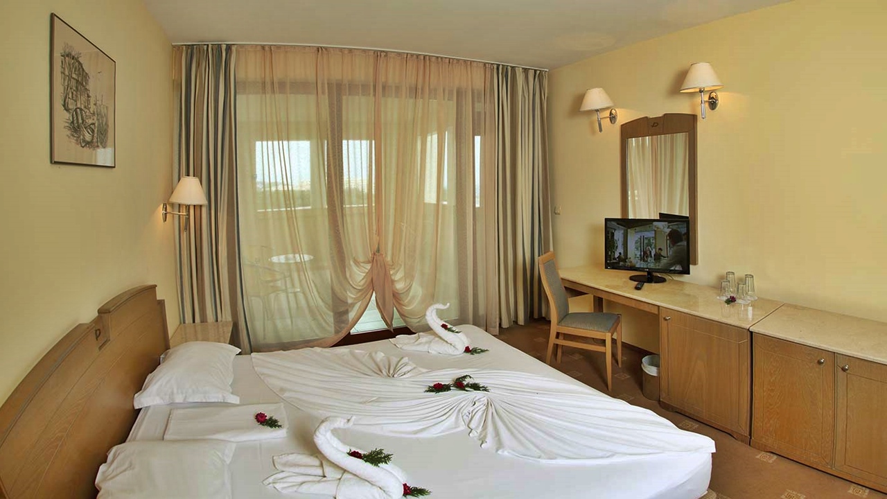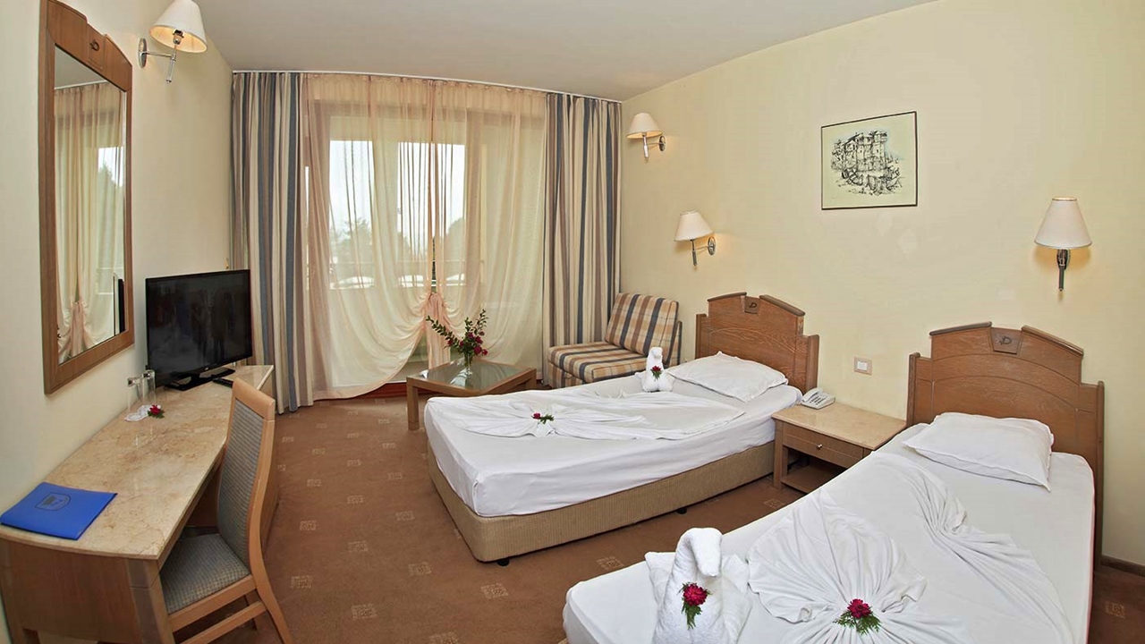 - Двойна стая Парк/Море - 26-28 кв.м. Помещението разполага с две единични легла, които при желание на гостите могат да бъдат събрани, и едно допълнително легло под формата на разтегателен фотьойл. Може да бъде по избор с гледка към парка или морето