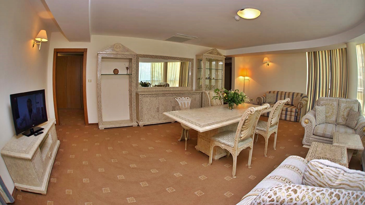 - Апартамент Делукс / Делукс частично море- 40-42 кв.м. Състои се от две преходни помещения с междинна врата - хол с кът за сядане с двоен разтегателен диван и спалня с голямо легло.