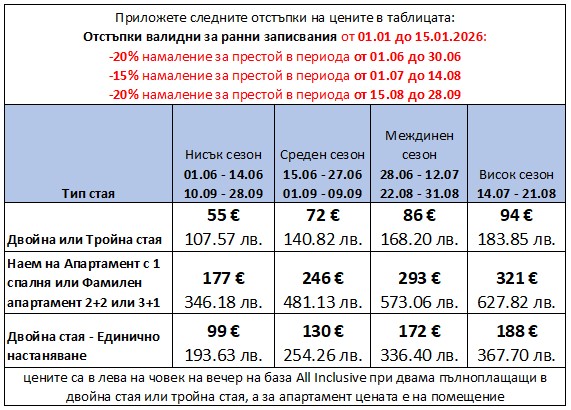 - цената за апартамент с 1 спалня или фамилен апартамент е на помещение (2+2 или 3+1)