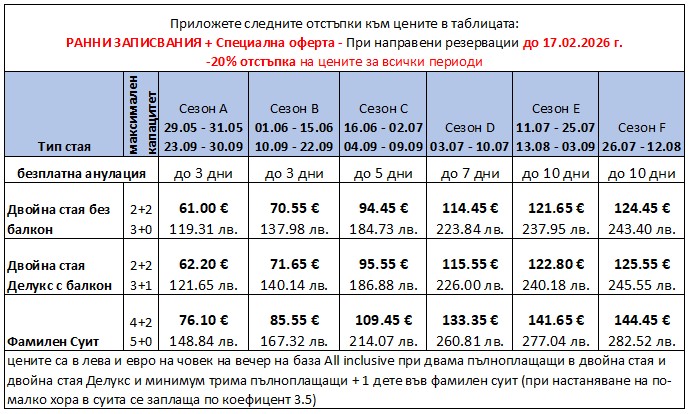 - за периодите 29.05 - 15.06 и 10.09 - 30.09, безплатна анулация до 3 дена преди настаняване