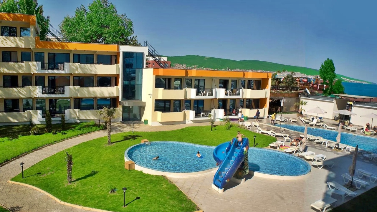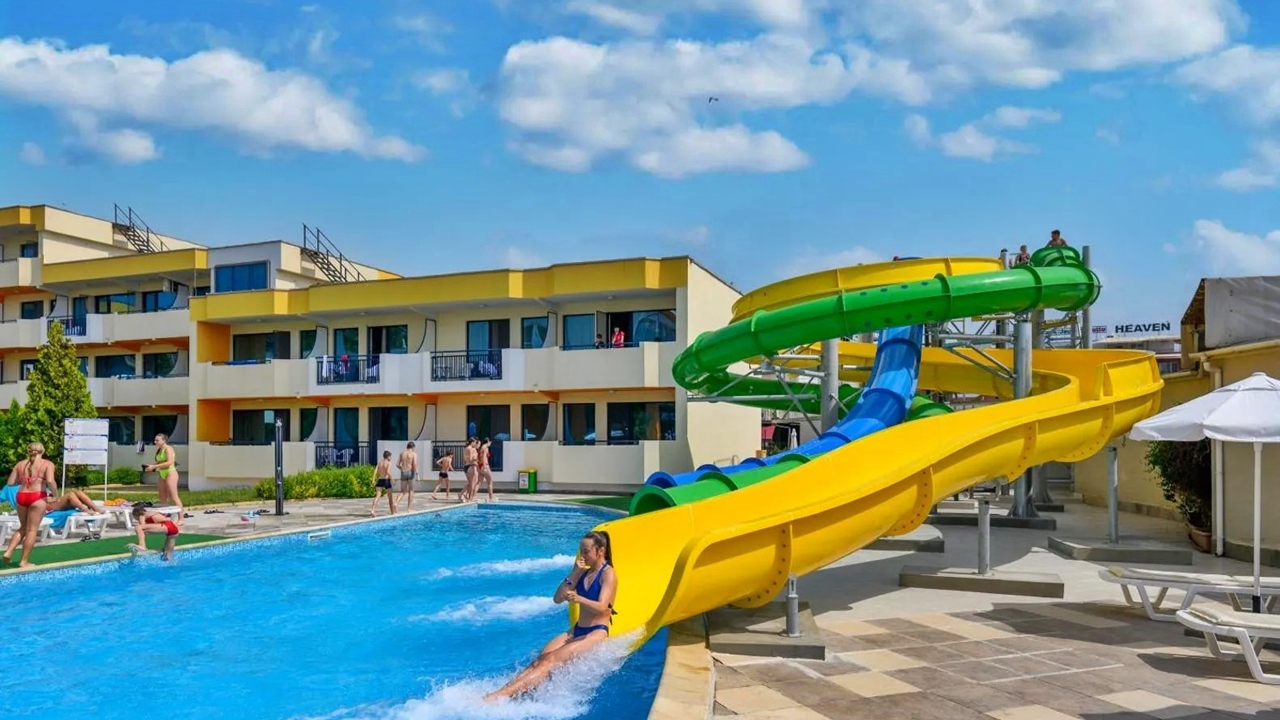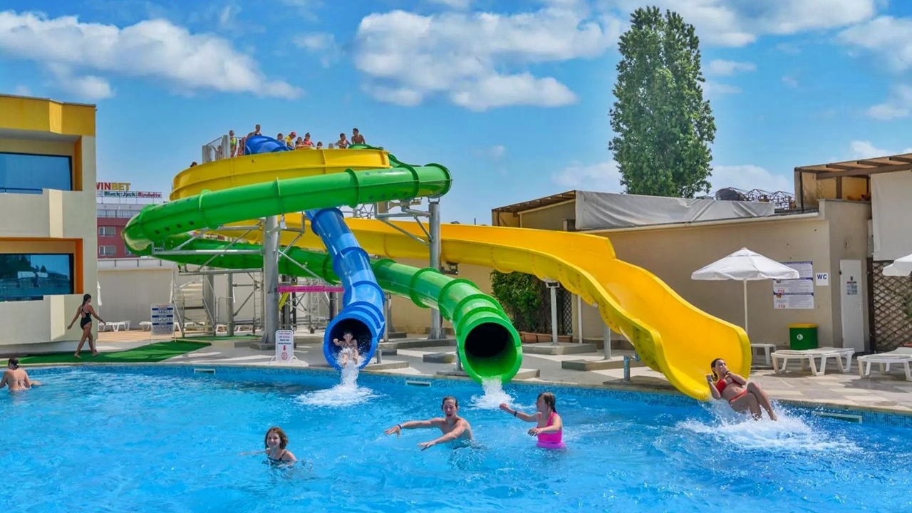 - Външен басейн с с дължина 80 м с 3 водни пързалки