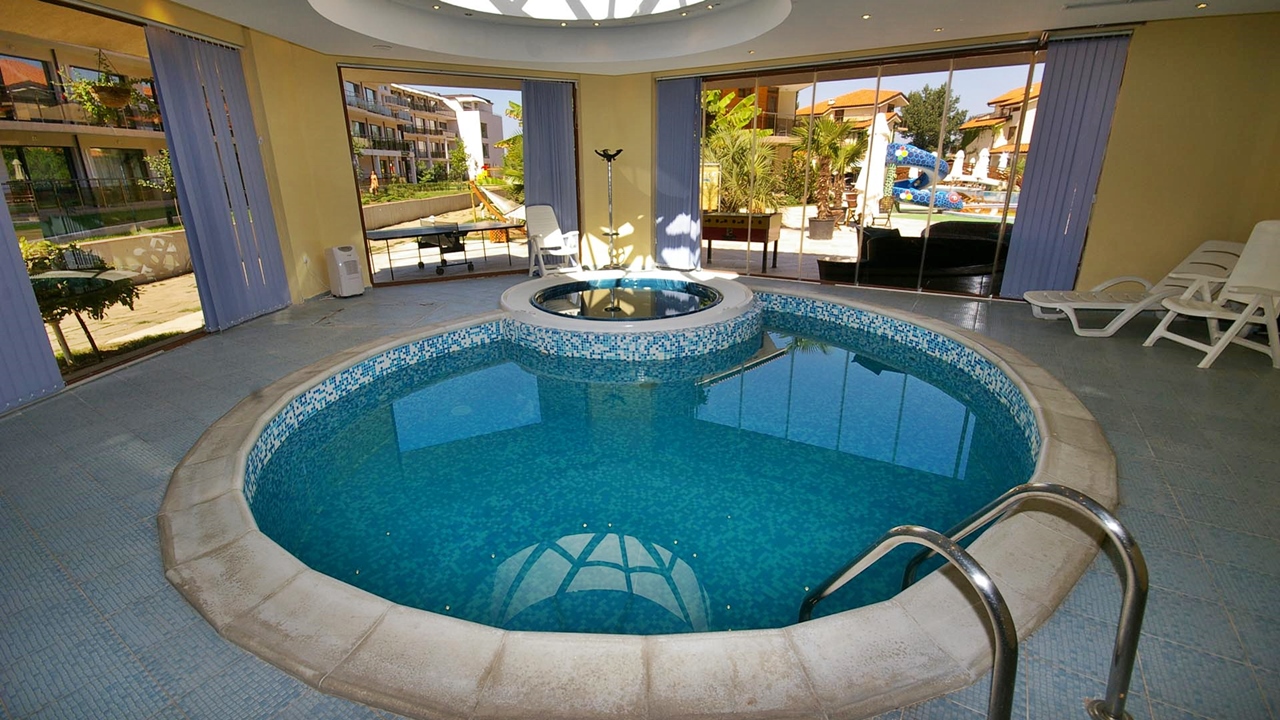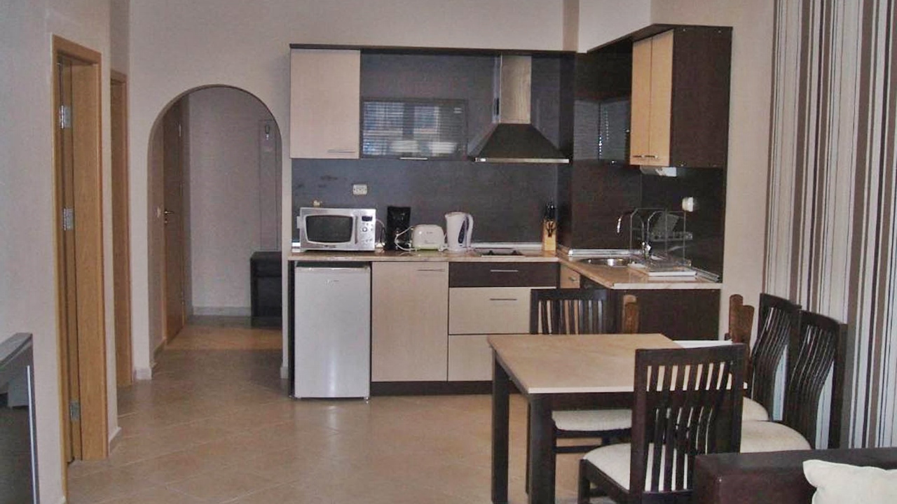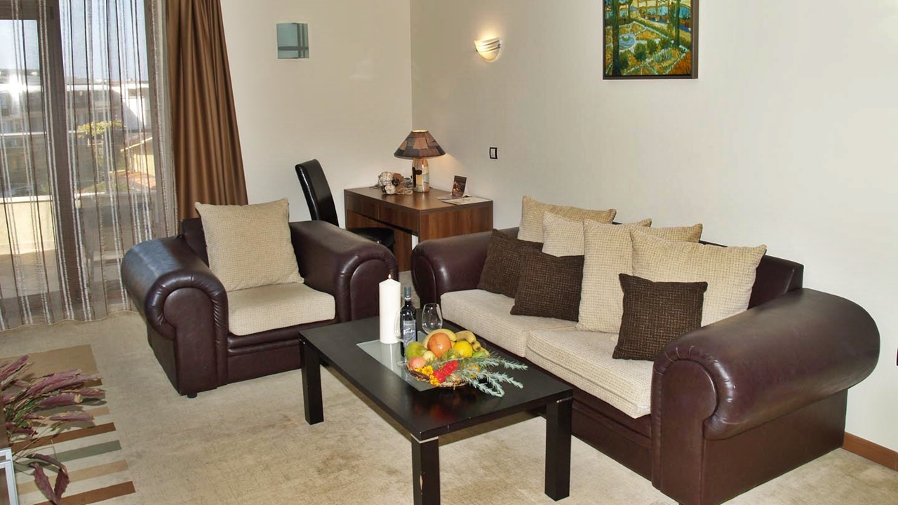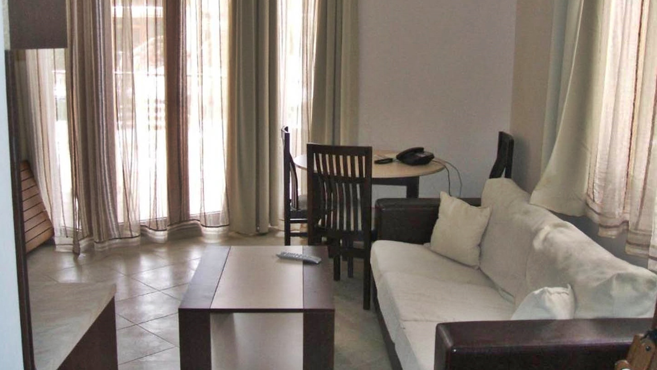 - апартамент с 1 спалня - приблизителна площ около 50 м2 във вили и около 70 кв.м. в анекс сграда Състоят се от едно спално помещение (двойно легло) и всекидневна с разтегателен двоен диван, напълно оборудван кухненски бокс с маса за хранене, сателитна телевизия, индивидуален климатик, тераса с изглед басейн/парков изглед, телефон, санитарен възел с вана и/или душ кабина, сешоар