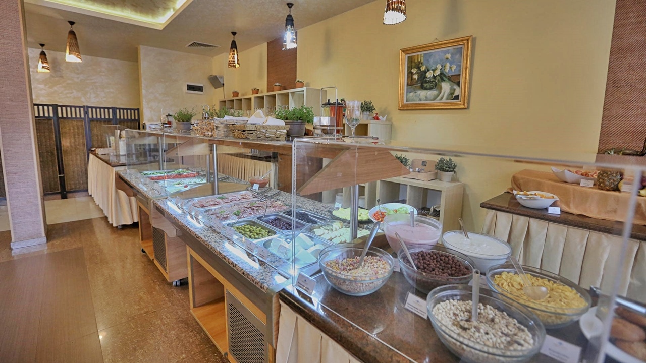 - Закуска на бюфет /08:00 – 10:00/- разнообразие от топли и студени ястия, яйчени специалитети, разнообразие от млечни продукти, колбаси и сирена, селекция от хлебни изделия, зърнени храни, плодове и зеленчуци, студени и топли напитки.