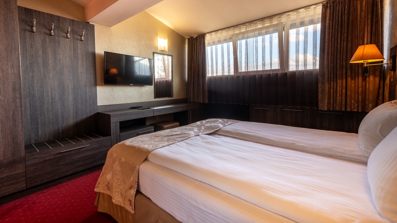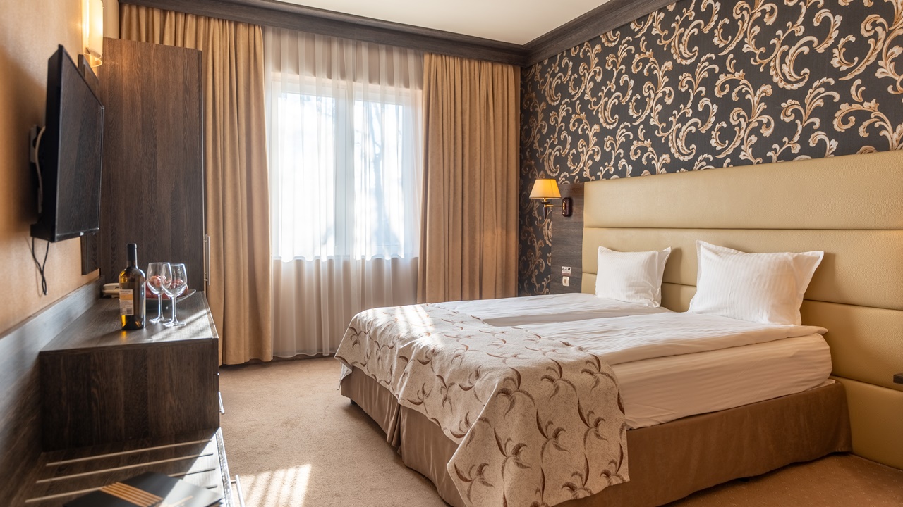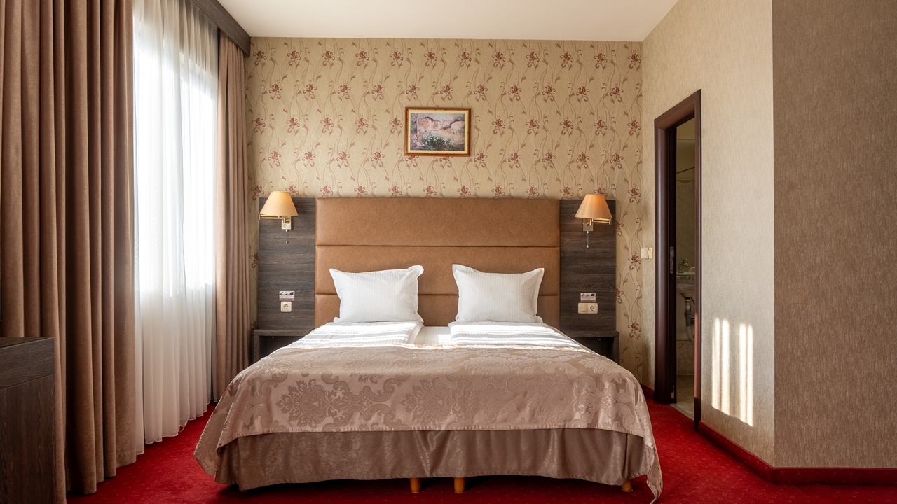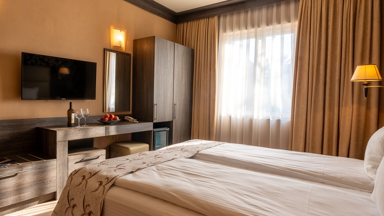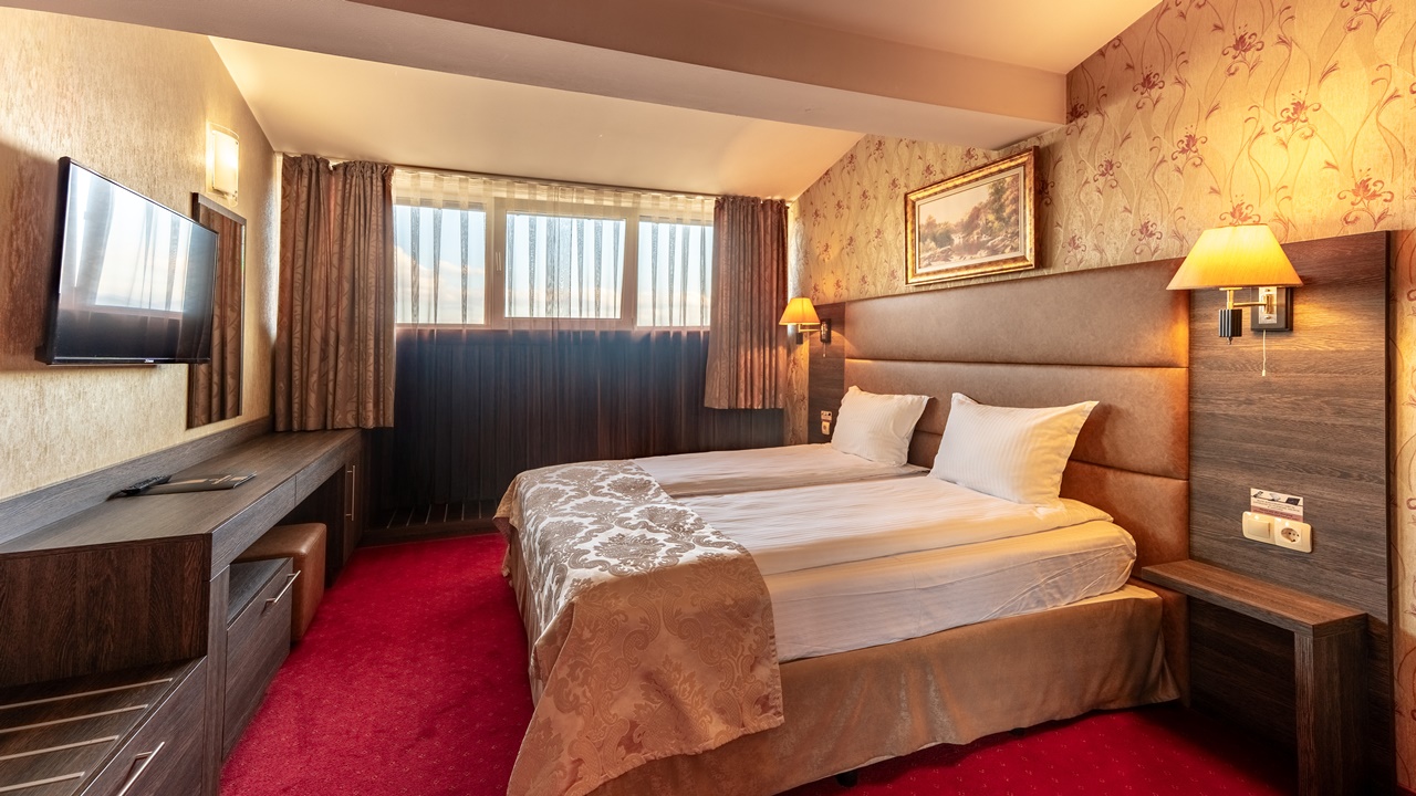 - Двойна стандартна стая - Елегантна и уютна, с изглед към басейна. Удобства: спалня, плоскоекранен ТВ със сателитни канали, Wi-Fi, сейф, минибар, работно бюро, баня с вана или душ, сешоар, електронна заключваща система