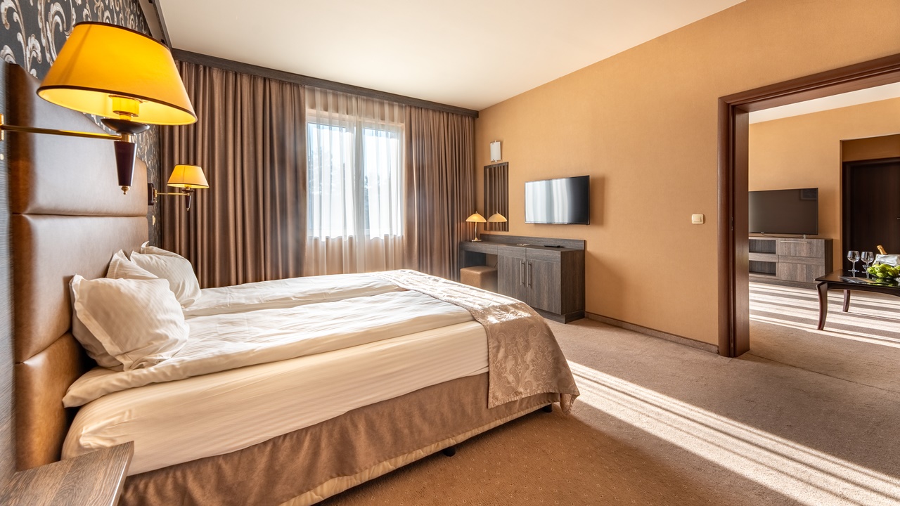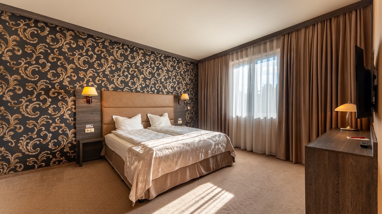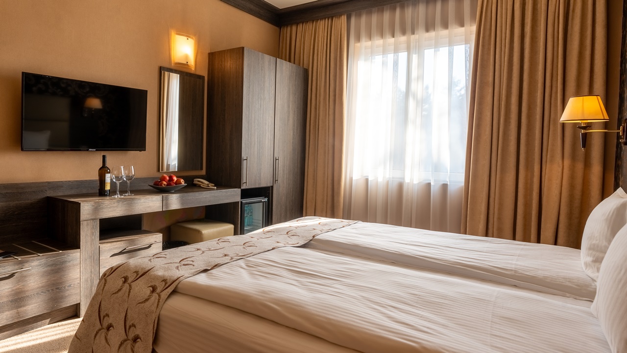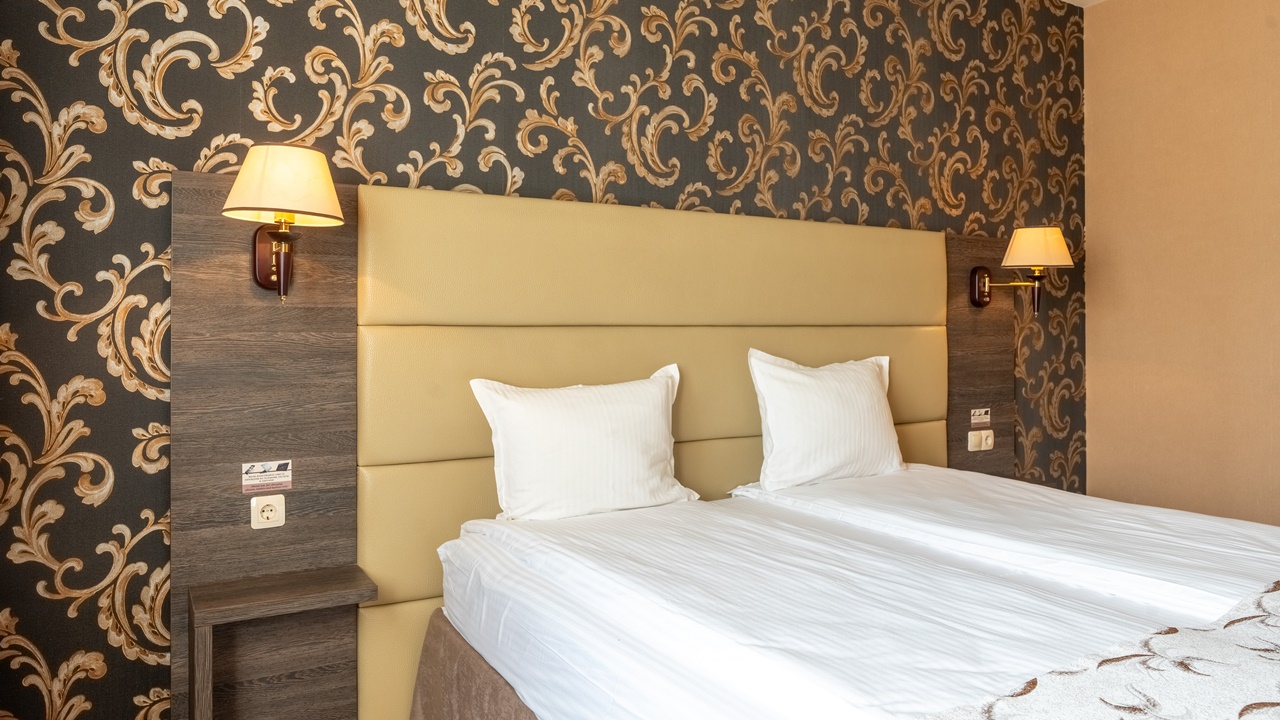 - Двойна стандартна стая - Елегантна и уютна, с изглед към басейна. Удобства: спалня, плоскоекранен ТВ със сателитни канали, Wi-Fi, сейф, минибар, работно бюро, баня с вана или душ, сешоар, електронна заключваща система