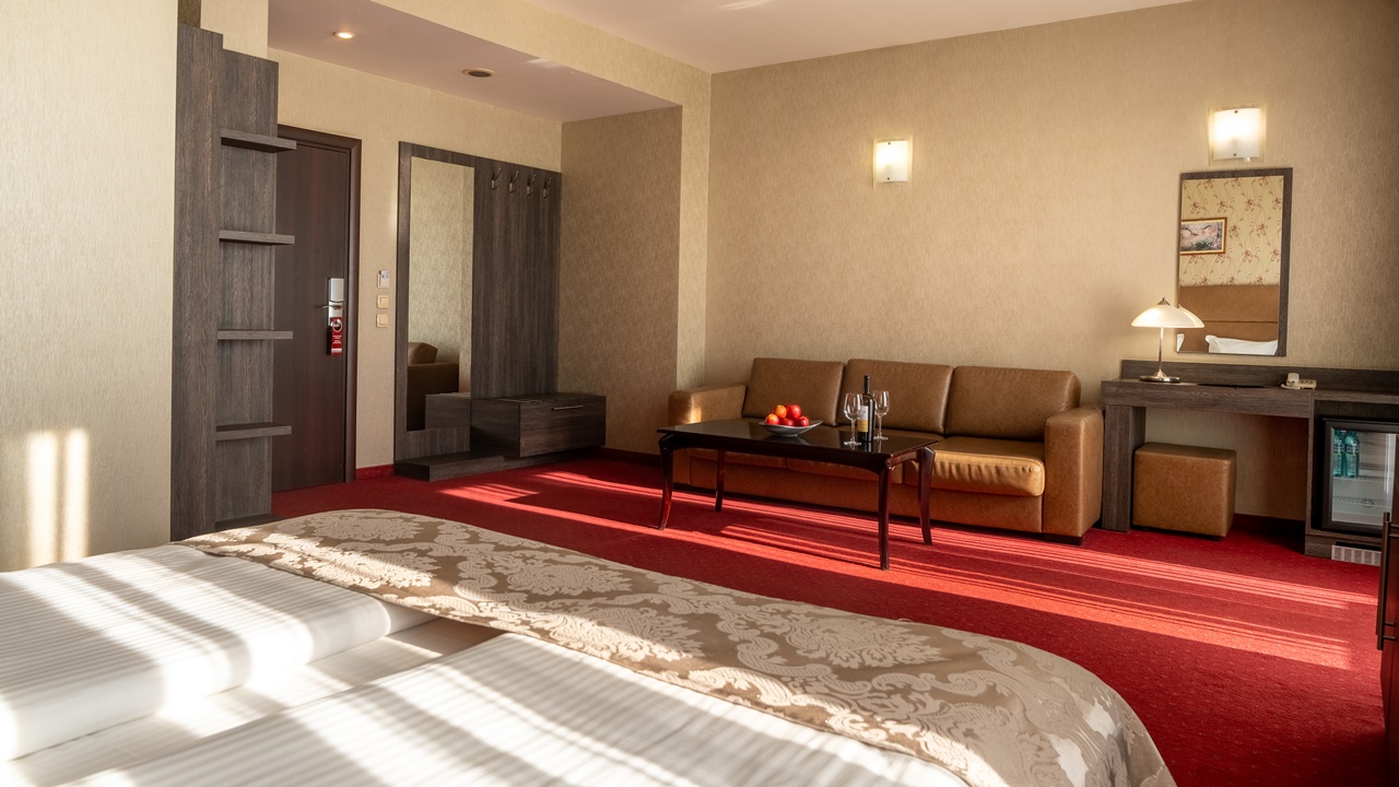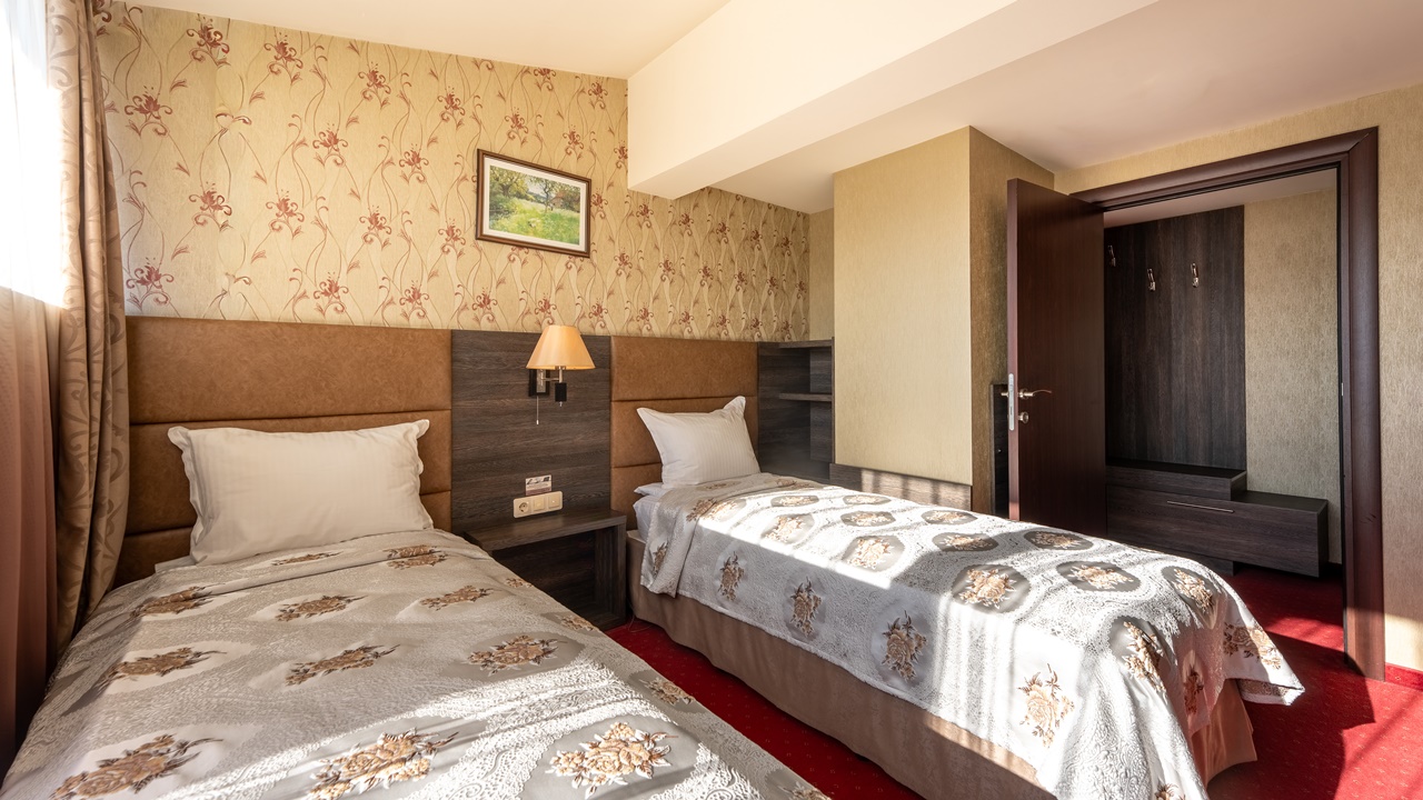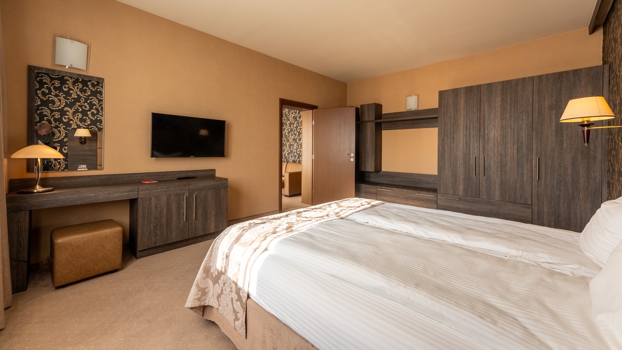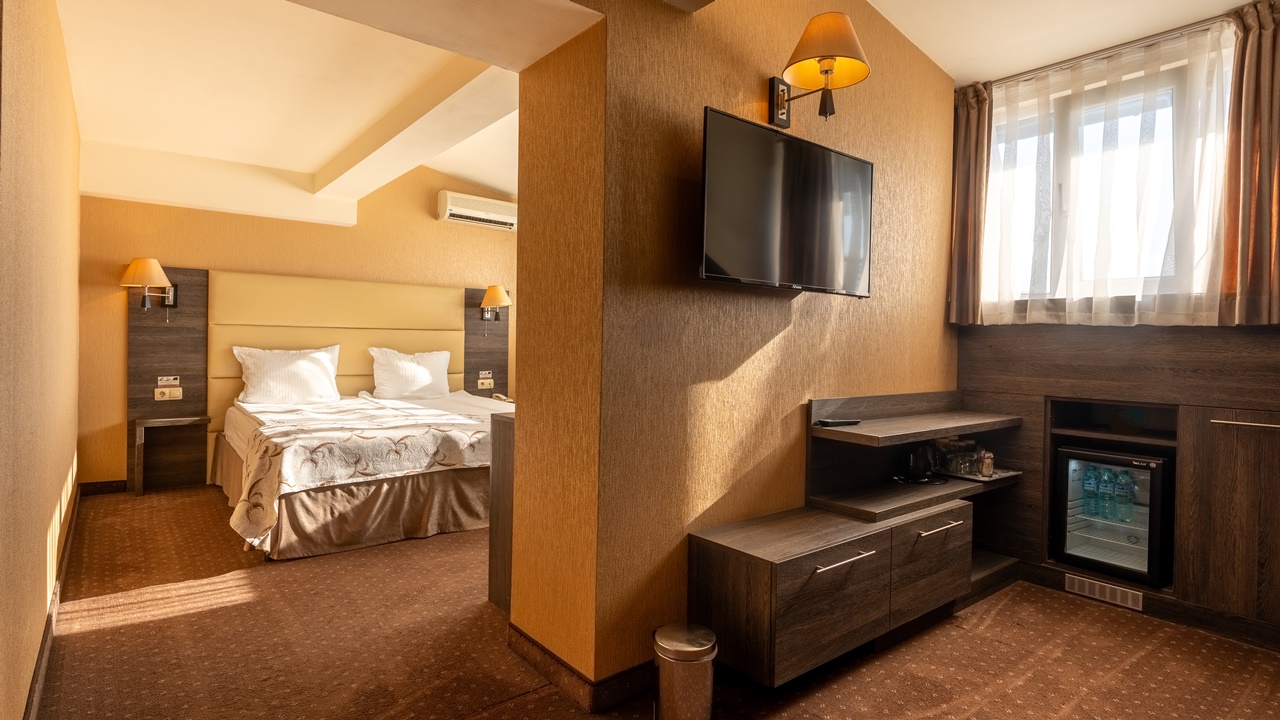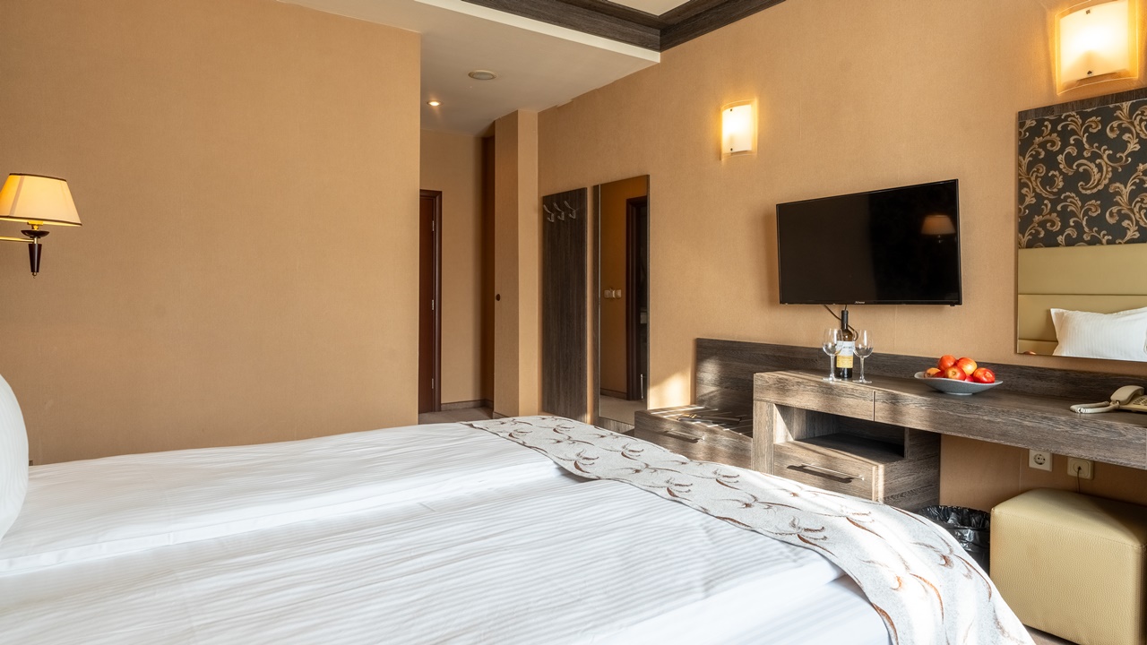 - Двойна стая лукс - Стаята е с размер 36 кв. м., двойно легло и разтегателен диван, телевизор с плосък екран, баня с вана, сешоар и климатик;