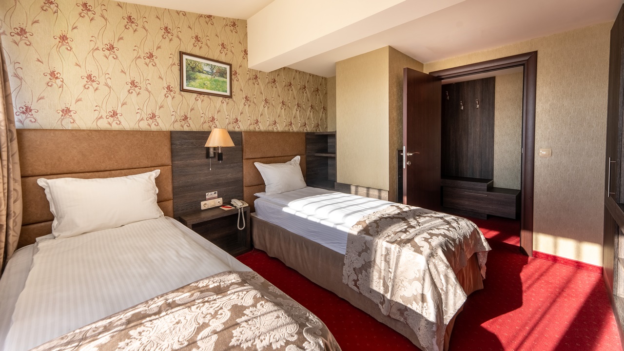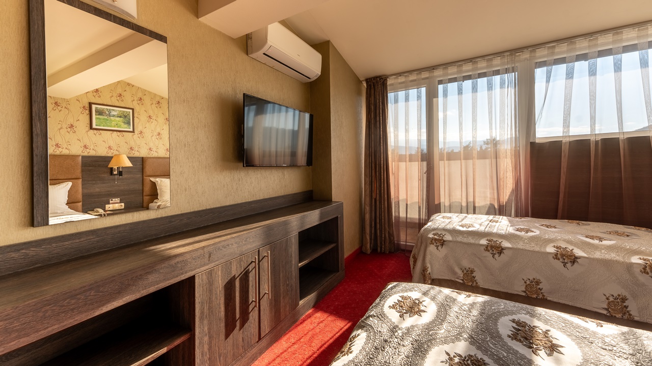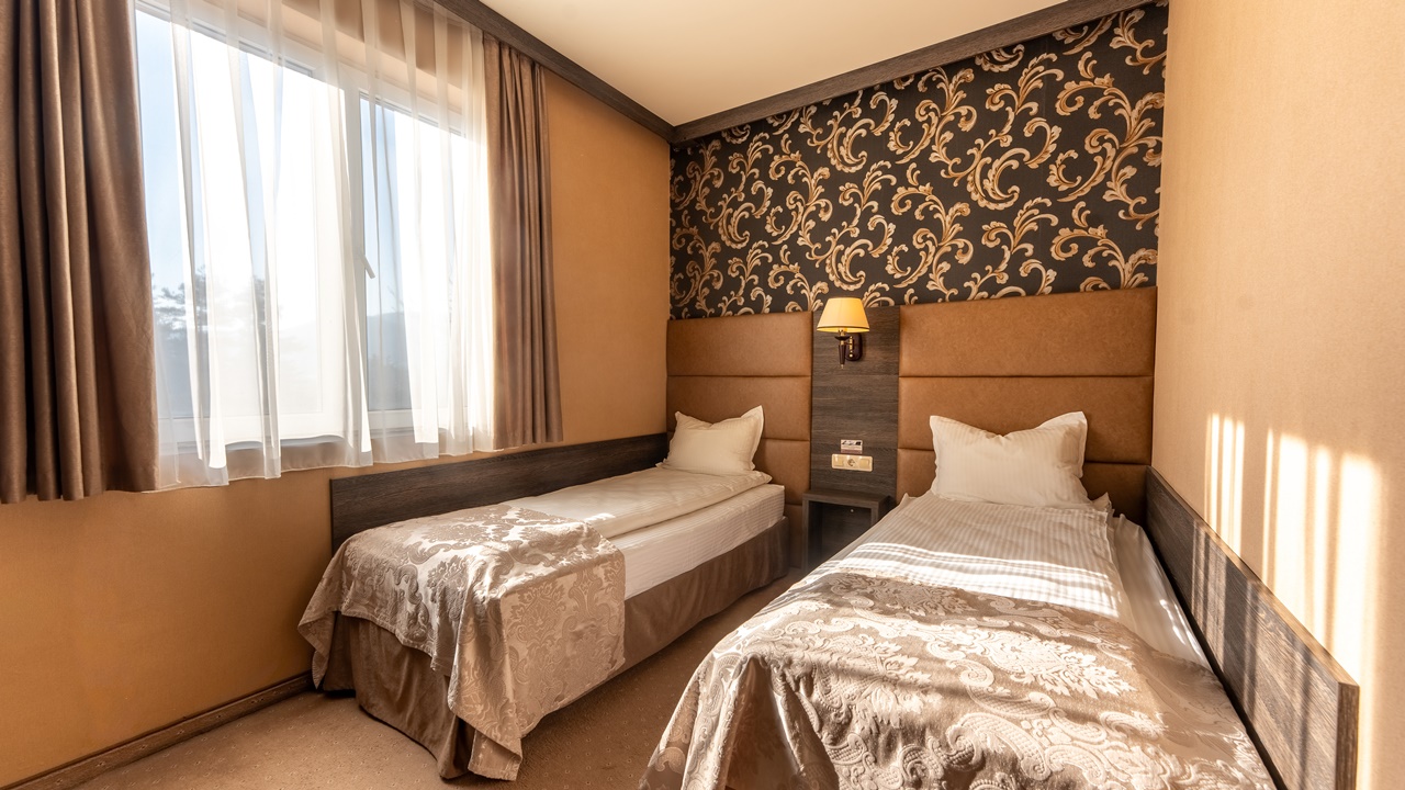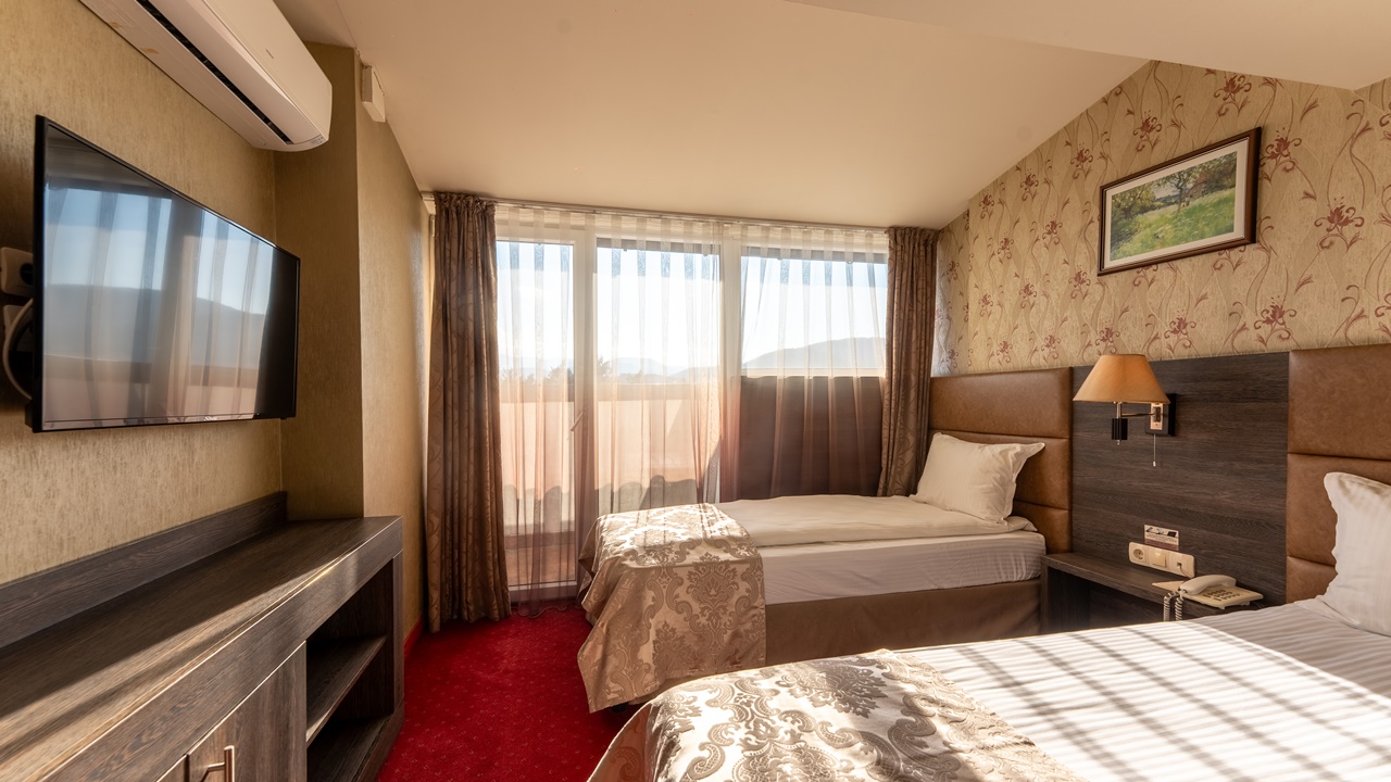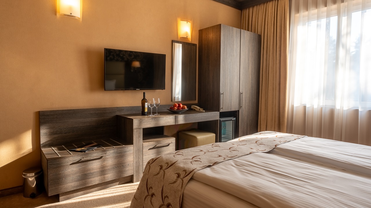 - Единична стая - Стаята е с размер 15 кв. м. и разполага с двойно легло, баня с душ, сейф, плоскоекранен телевизор, сешоар и климатик;