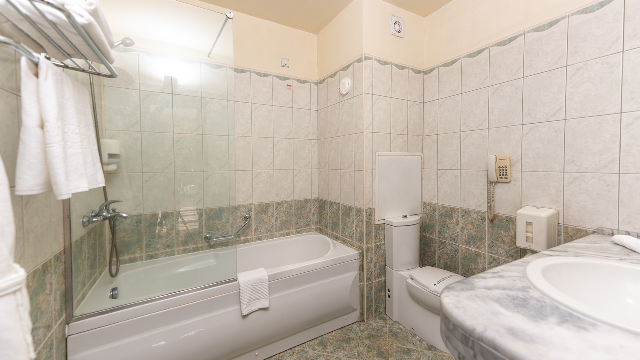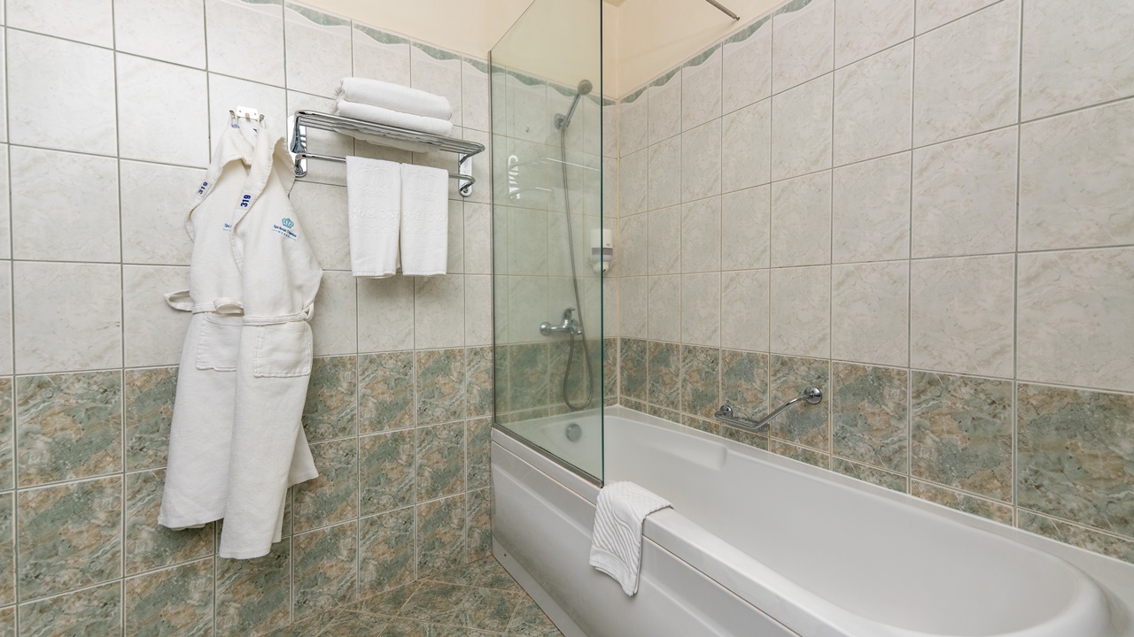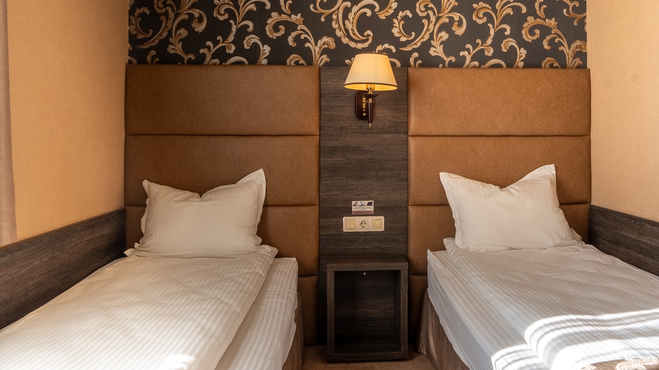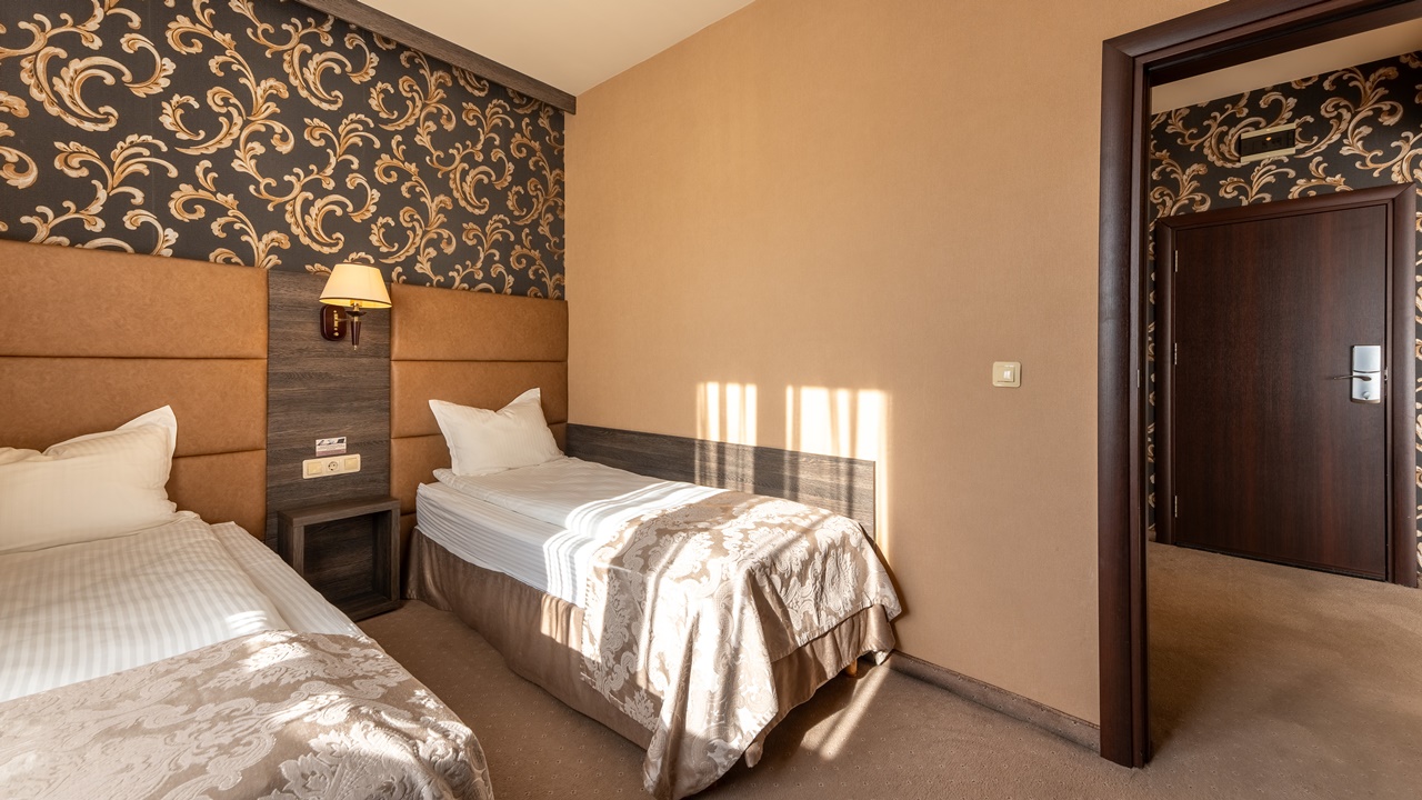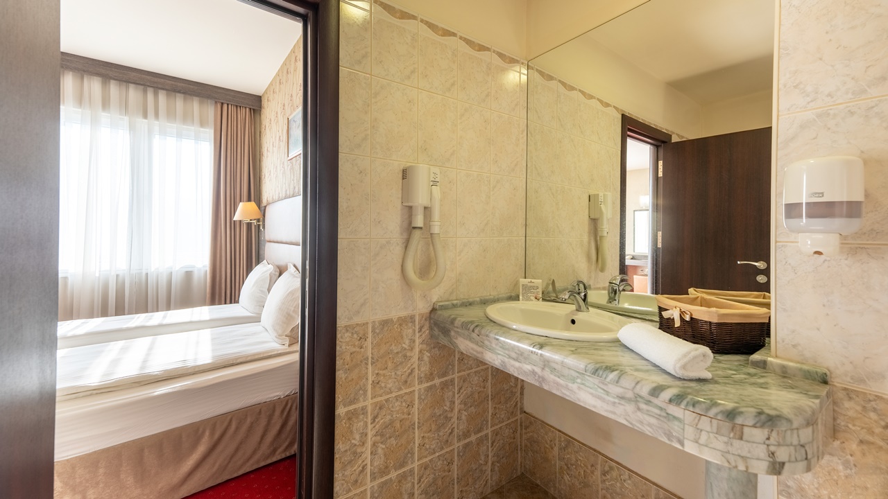 - Единична стая - Стаята е с размер 15 кв. м. и разполага с двойно легло, баня с душ, сейф, плоскоекранен телевизор, сешоар и климатик;