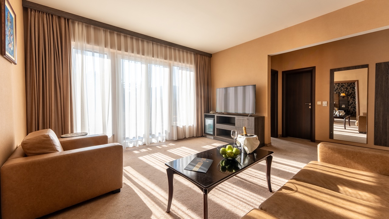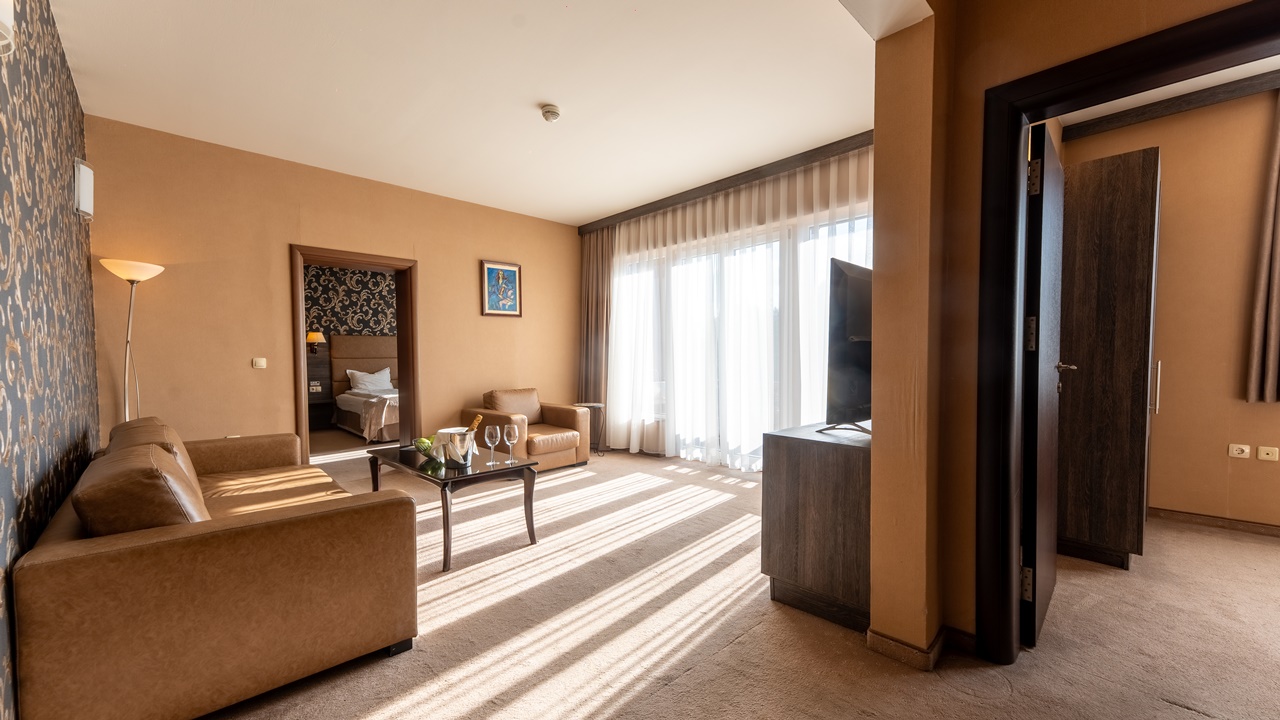 - Апартамент - Идеален за семейства – простор и удобство. Удобства: 1 спалня, 1 стая с две единични легла, хол, кафемашина, тераса, два ТВ, Wi-Fi и панорамна гледка