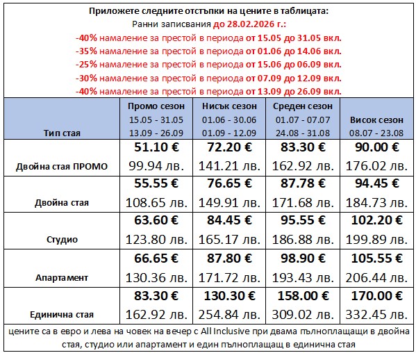 - За периода 01.07.2026 - 31.08.2026: Офертата е валидна при минимален престой от 5 нощувки