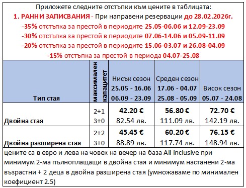 - Хотелът си запазва правото да прекрати отстъпките за ранно записване по всяко едно време!