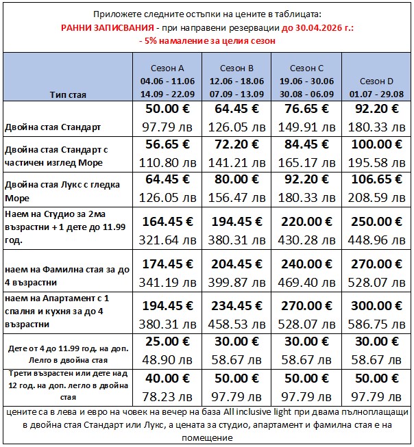 1 нощувка за 1 лице с All iclusive light (от 04.06 до 11.06 и от 14,09 до 22.09) |