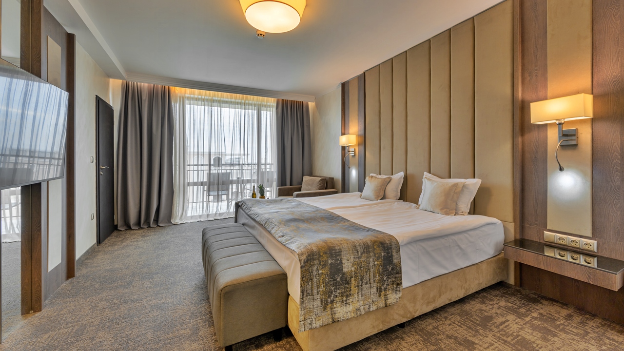 - двойна стая Делукс с частичен или фронтален изглед Море - Двойните стаи делукс с гледка море са с площ около 45 кв.м. и разполагат с комфортна king size спалня, разтегателен фотьойл, богат асортимент на артикули в Мини Бара, интерактивна Телевизия и WiFi достъп, гардероб, климатична система с контрол, сешоар и тоалетни принадлежности, blackout завеси и тераса с прекрасна гледка към морето и басейна