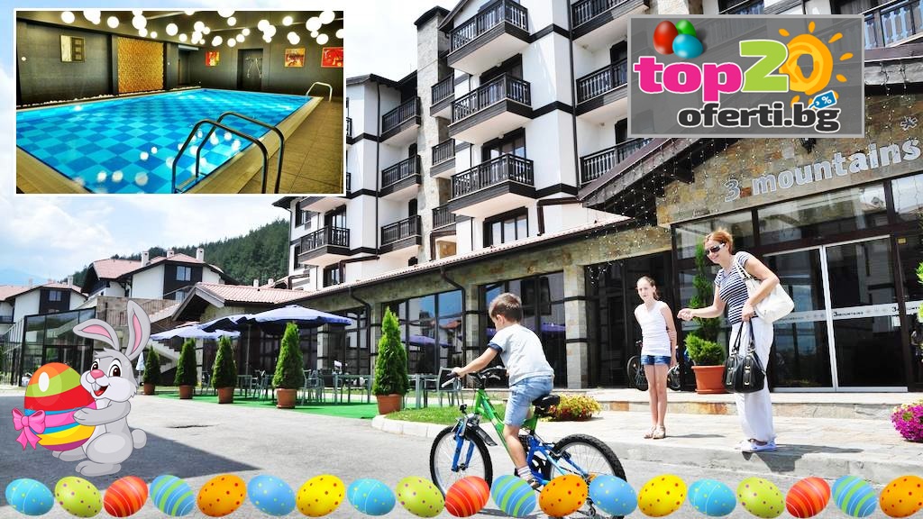 Хотел 3 Планини, Разлог, е луксозен хотел, изграден в характерен алпийски архитектурен стил, съчетан с традиционни и национални елементи. Комплексът предлага настаняване в луксозни студия и едноспални апартаменти. Всички стаи са обзаведени с телевизор с кабелна телевизия, мини бар, а някои от апартаментите разполагат и душ кабина. Всички стаи имат южно изложение и собствен балкон с прекрасен изглед към върховете на Пирин и Родопите. На гостите на хотела са на разположение още: билярд, тенис на маса, мини бар, колела под наем, процедури, лимфен дренаж. Организиране на музикална програма, планински преходи, рафтинг, конна езда и уроци по конен спорт.