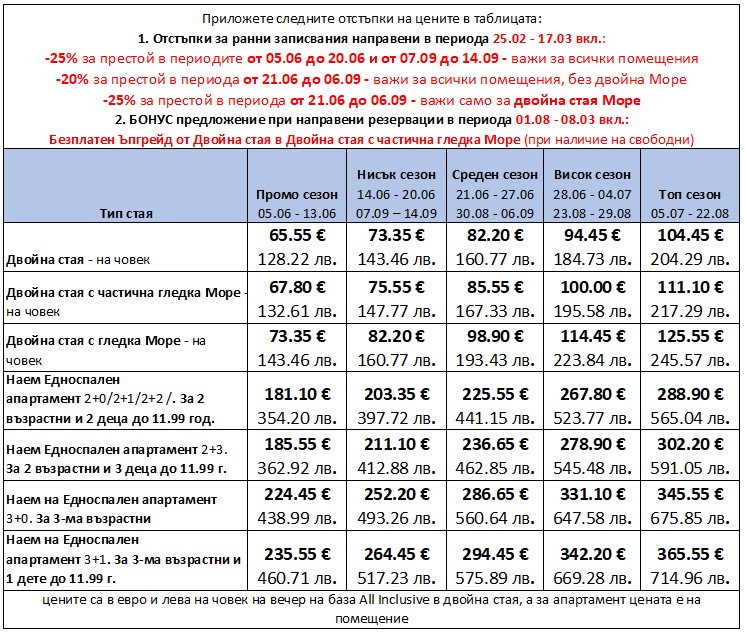 | Цени за други помещения и периоди виж секция "Условия на офертата" | |||||||