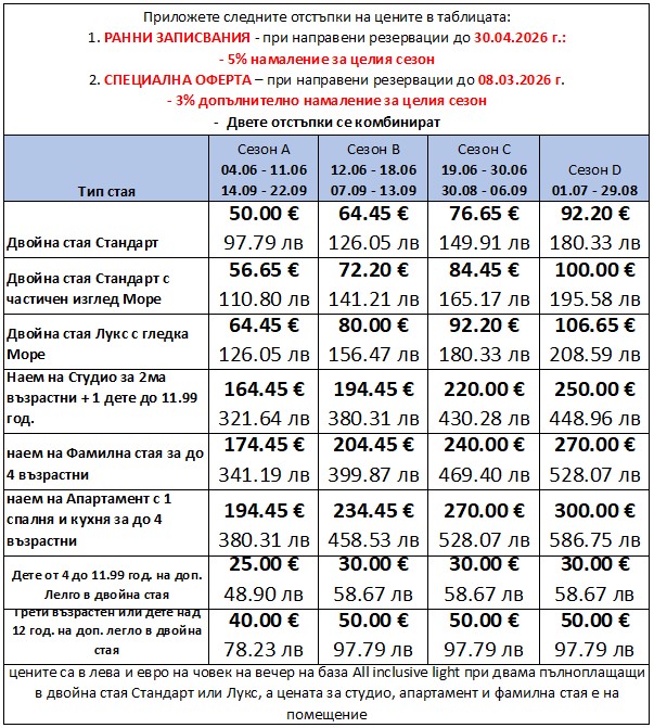 - За периода 04.06.2026 - 22.09.2026: Офертата е валидна при минимален престой от 3 нощувки