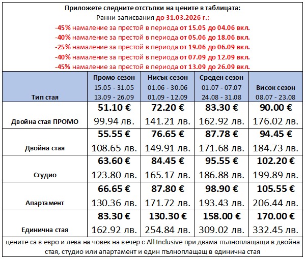 - За периода 01.09.2026 - 12.09.2026: Офертата е валидна при минимален престой от 3 нощувки