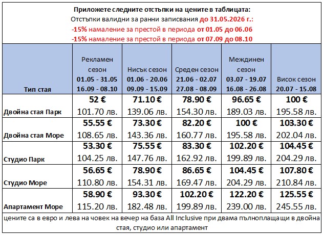 1 нощувка за 1 лице с All inclusive (от 01.05 до 31.05 и от 16.09 до 08.10) |