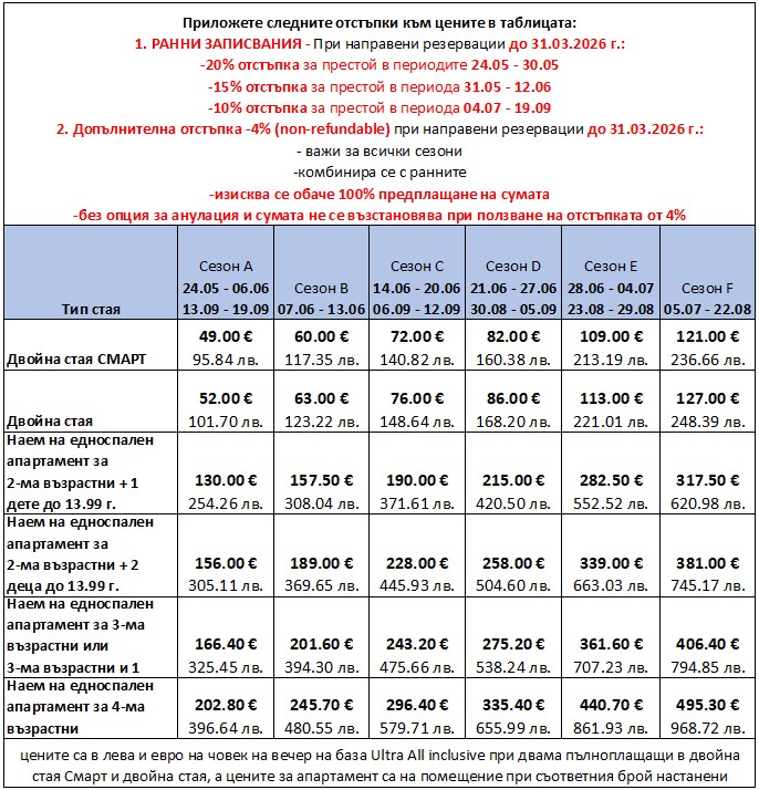 • За периода 14.06.2026 - 10.09.2026: Изисква се минимален престой от 5 нощувки (възможен е и по-кратък престой, но без отстъпката за ранни записвания)