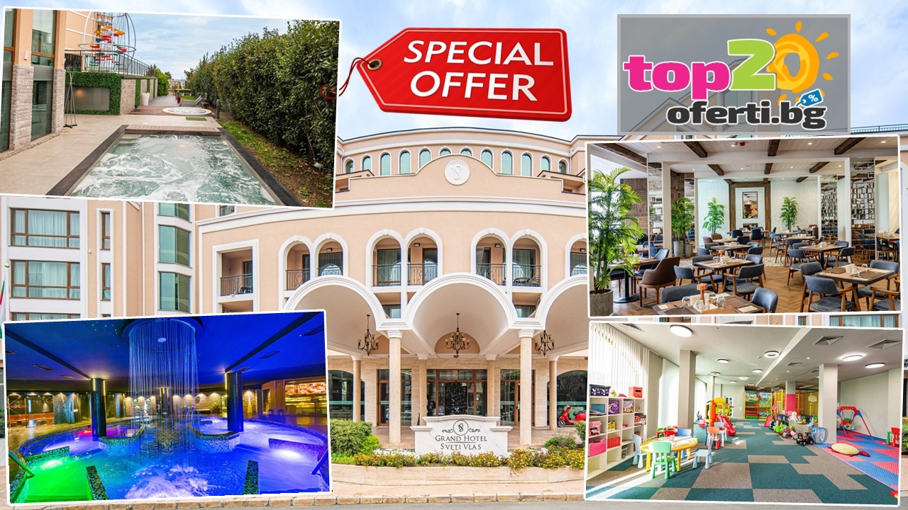 Гранд Хотел Свети Влас 5*, Свети Влас, е разположен на самия бряг на един от най-посещаваните морски курорти - Свети Влас. Хотелът предлага комфортни и просторни помещения, напълно обзаведени и подходящи за пълноценна почивка. От балконите на повечето помещения се разкрива невероятна гледка към Черно море. В 5-звездния Гранд хотел Свети Влас можете да избирате разнообразие от ястия с превъзходен вкус.