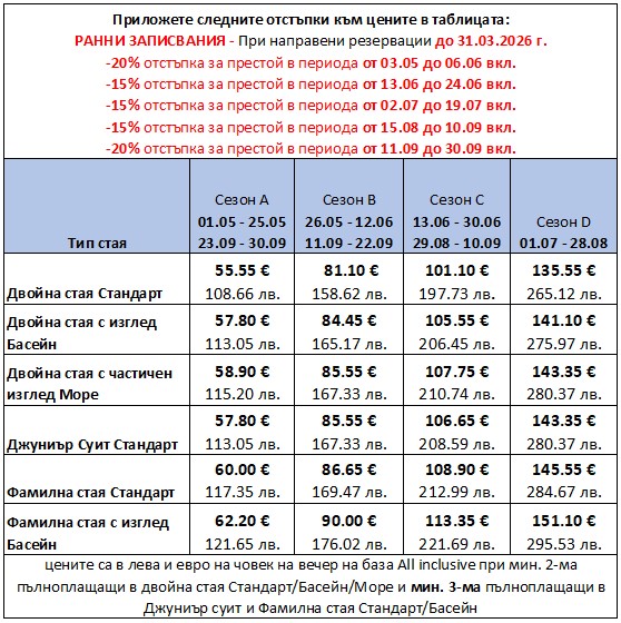 - За периода 26.05.2026 - 16.06.2026: Офертата е валидна при минимален престой от 4 нощувки