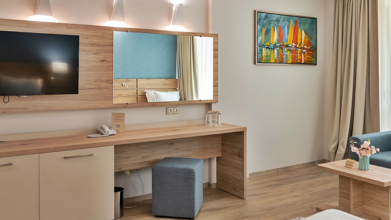 - Студио Море - имат фронтална или странична гледка към морето, разполагат с три редовни легла или едно двойно и едно редовно легло, разтегателен фотьойл, баня с душ и тоалетна, сешоар, огледало, климатик, мини бар (срещу заплащане), сателитна телевизия, сейф (безплатно), телефон и балкон