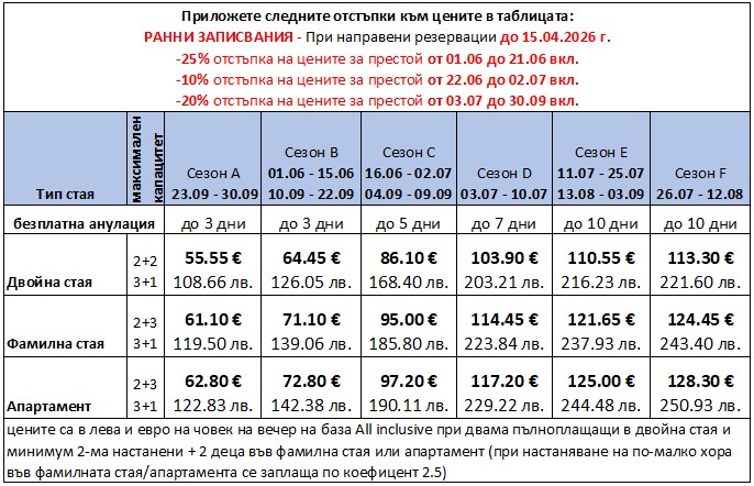 - Офертата важи само за нови резервации направени след 01.04.2026 г.