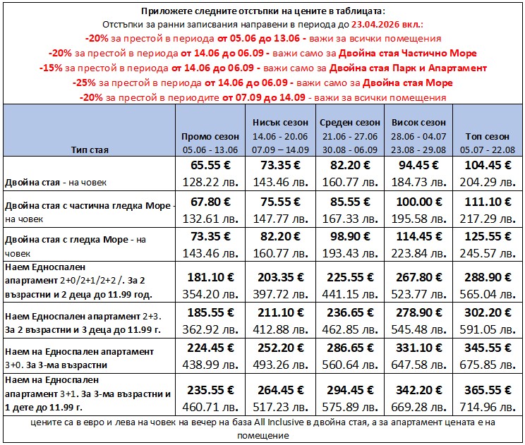 - 14.06 - 20.06 и 07.09 – 14.09 – безплатна анулация до 5 дни преди датата на настаняване