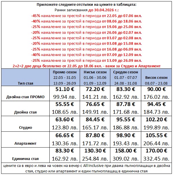 Второ дете се настанява безплатно на допълнително легло в студио или апартамент на база пакета (важи само за периода 22.05-18.06)